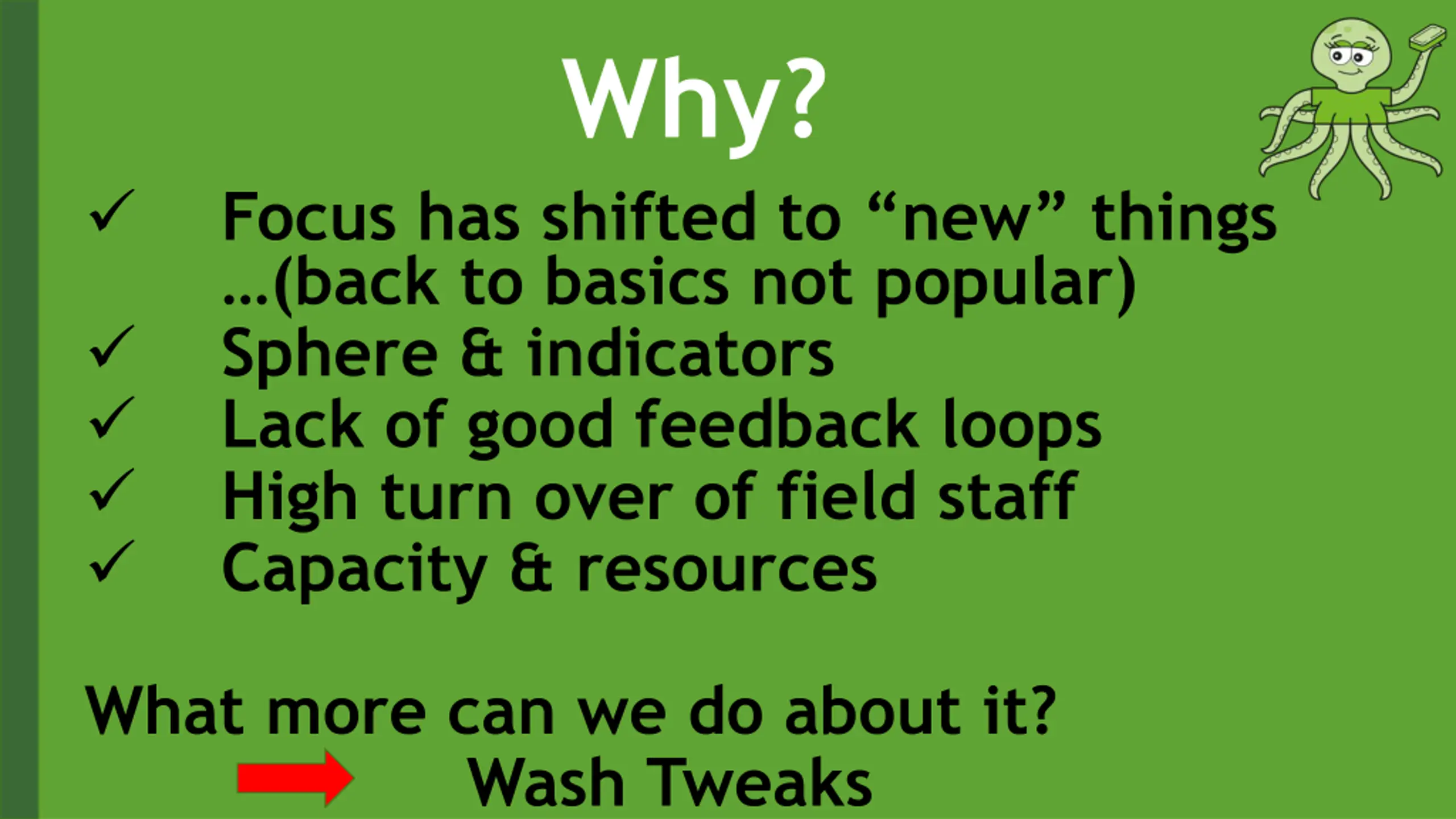 Why? Focus has shifted to new things (back to basics not popular) Sphere & indicators Lack of good feedback loops High turn over of field staff Capacity & resources What more can we do about it? Wash Tweaks