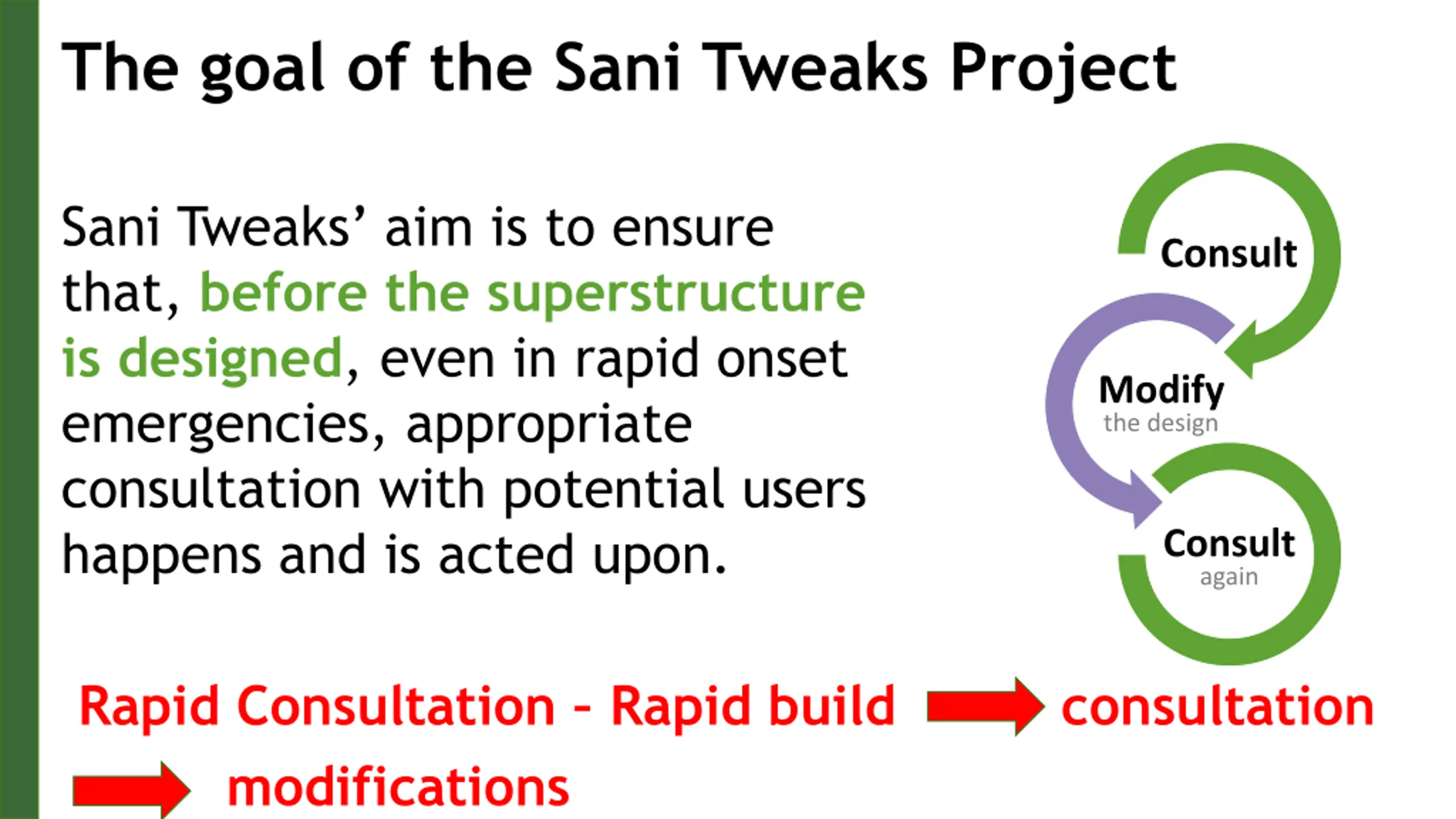 The goal of the Sani Tweaks Project Sani Tweaks aim is to ensure that, before the superstructure is designed, even in rapid onset emergencies, appropriate consultation with potential users happens and is acted upon. Consult Modify the design Consult again Rapid Consultation Rapid build consultation modifications