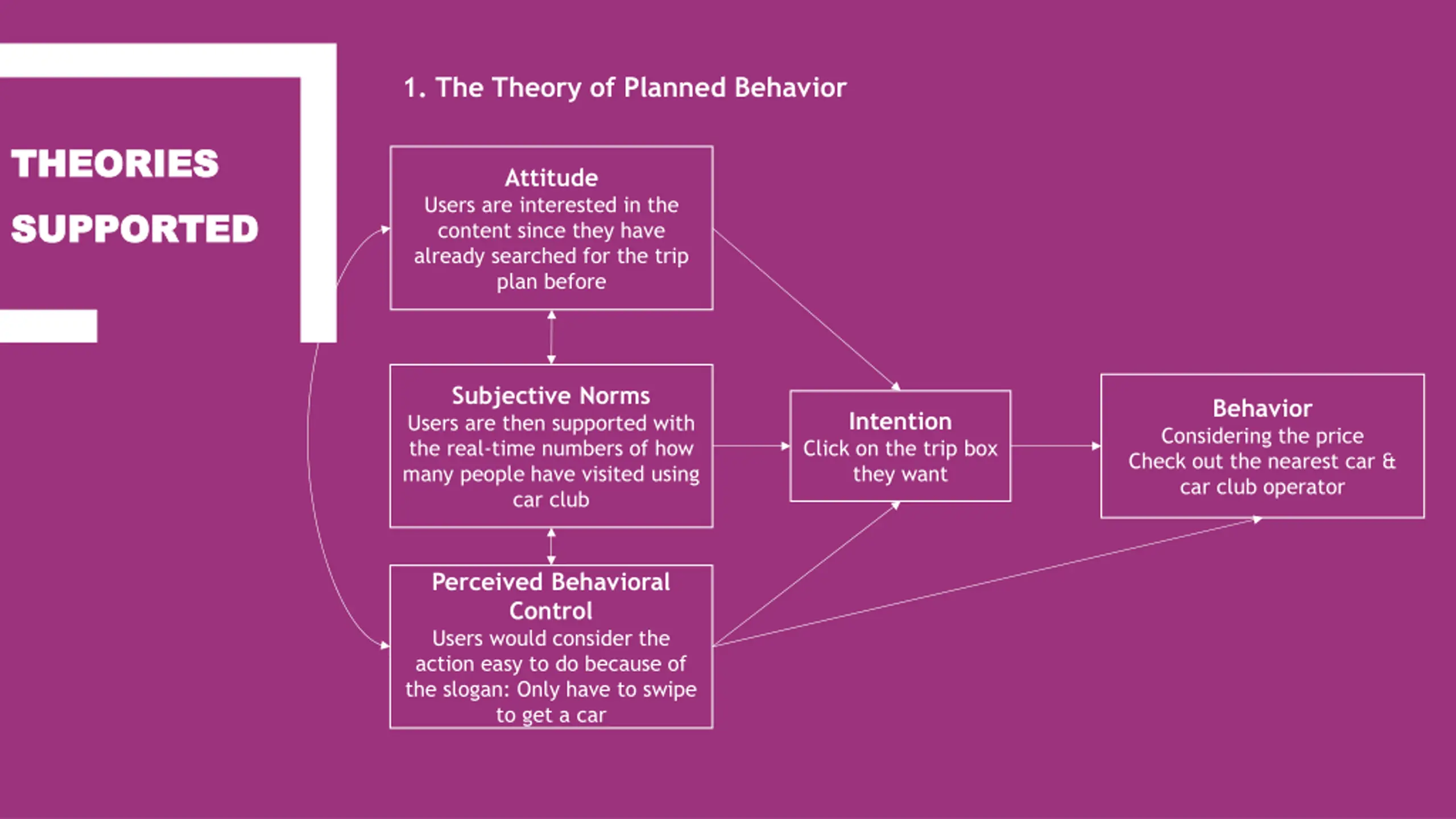 1. The Theory of Planned Behavior THEORIES THEORIES SUPPORTED SUPPORTED Attitude Users are interested in the content since they have already searched for the trip plan before Subjective Norms Users are then supported with the real-time numbers of how many people have visited using car club Behavior Intention Click on the trip box they want Considering the price Check out the nearest car & car club operator Perceived Behavioral Control Users would consider the action easy to do because of the slogan: Only have to swipe to get a car