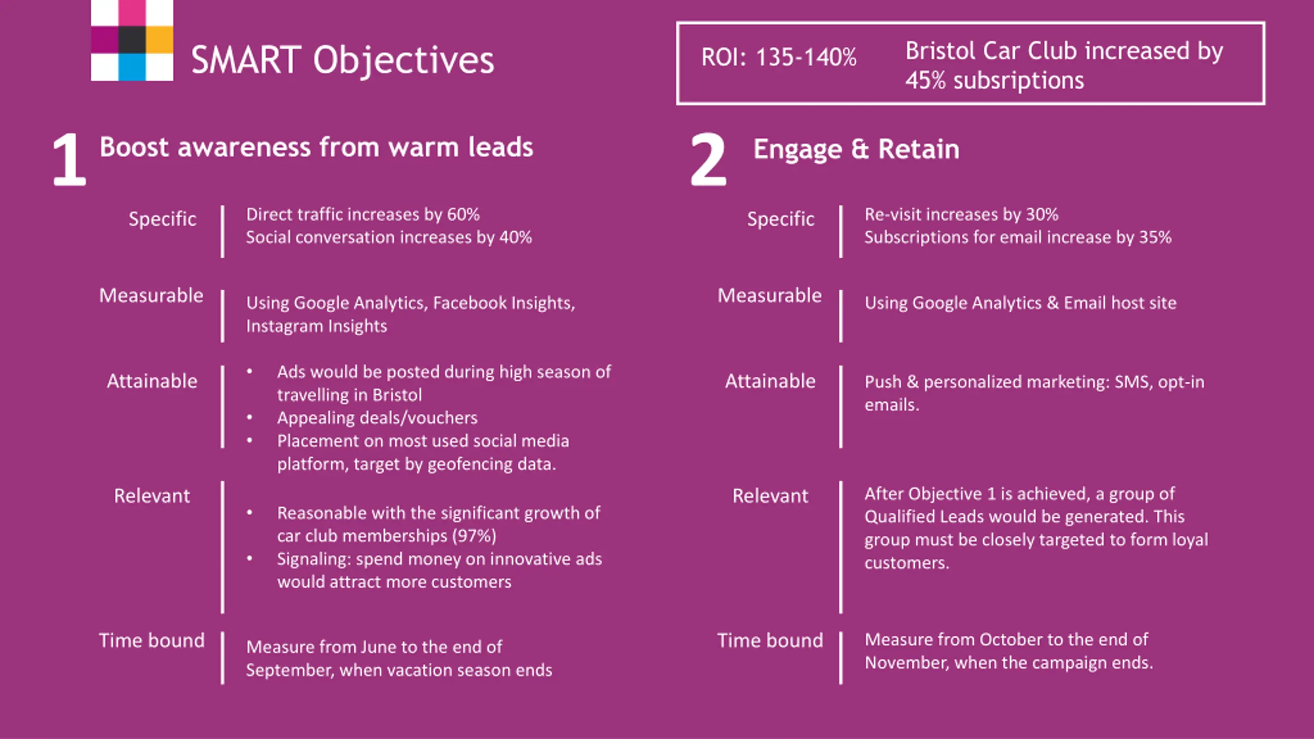 Bristol Car Club increased by 45% subsriptions SMART Objectives ROI: 135-140% 1 2 Boost awareness from warm leads Engage & Retain Direct traffic increases by 60% Social conversation increases by 40% Re-visit increases by 30% Subscriptions for email increase by 35% Specific Specific Measurable Measurable Using Google Analytics, Facebook Insights, Instagram Insights Using Google Analytics & Email host site Ads would be posted during high season of travelling in Bristol Appealing deals/vouchers Placement on most used social media platform, target by geofencing data. Attainable Attainable Push & personalized marketing: SMS, opt-in emails. After Objective 1 is achieved, a group of Qualified Leads would be generated. This group must be closely targeted to form loyal customers. Relevant Relevant Reasonable with the significant growth of car club memberships (97%) Signaling: spend money on innovative ads would attract more customers Time bound Time bound Measure from October to the end of November, when the campaign ends. Measure from June to the end of September, when vacation season ends