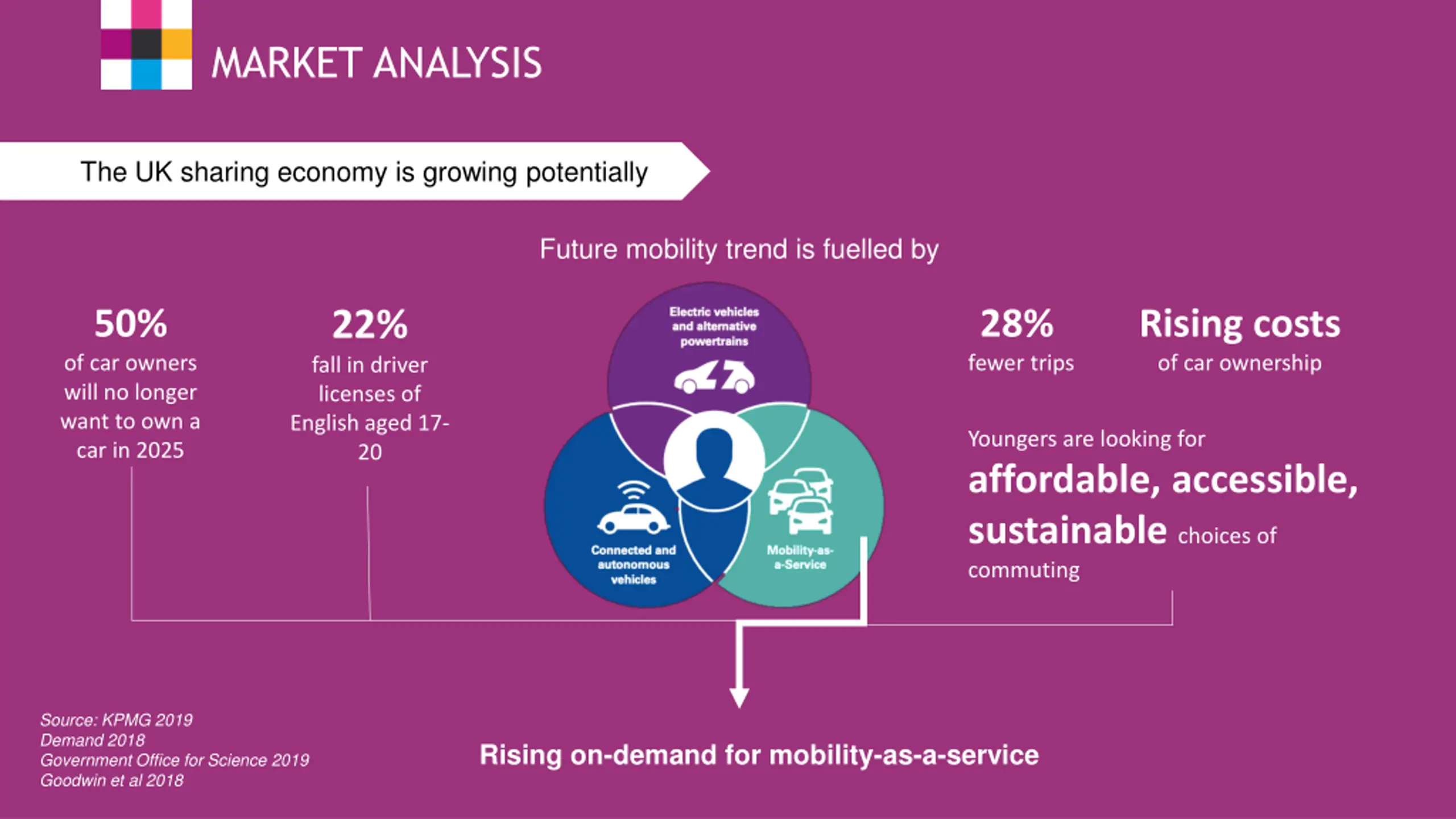 MARKET ANALYSIS The UK sharing economy is growing potentially Future mobility trend is fuelled by 50% of car owners will no longer want to own a car in 2025 28% fewer trips Rising costs of car ownership 22% fall in driver licenses of English aged 17- 20 Youngers are looking for affordable, accessible, sustainable choices of commuting Source: KPMG 2019 Demand 2018 Government Office for Science 2019 Goodwin et al 2018 Rising on-demand for mobility-as-a-service