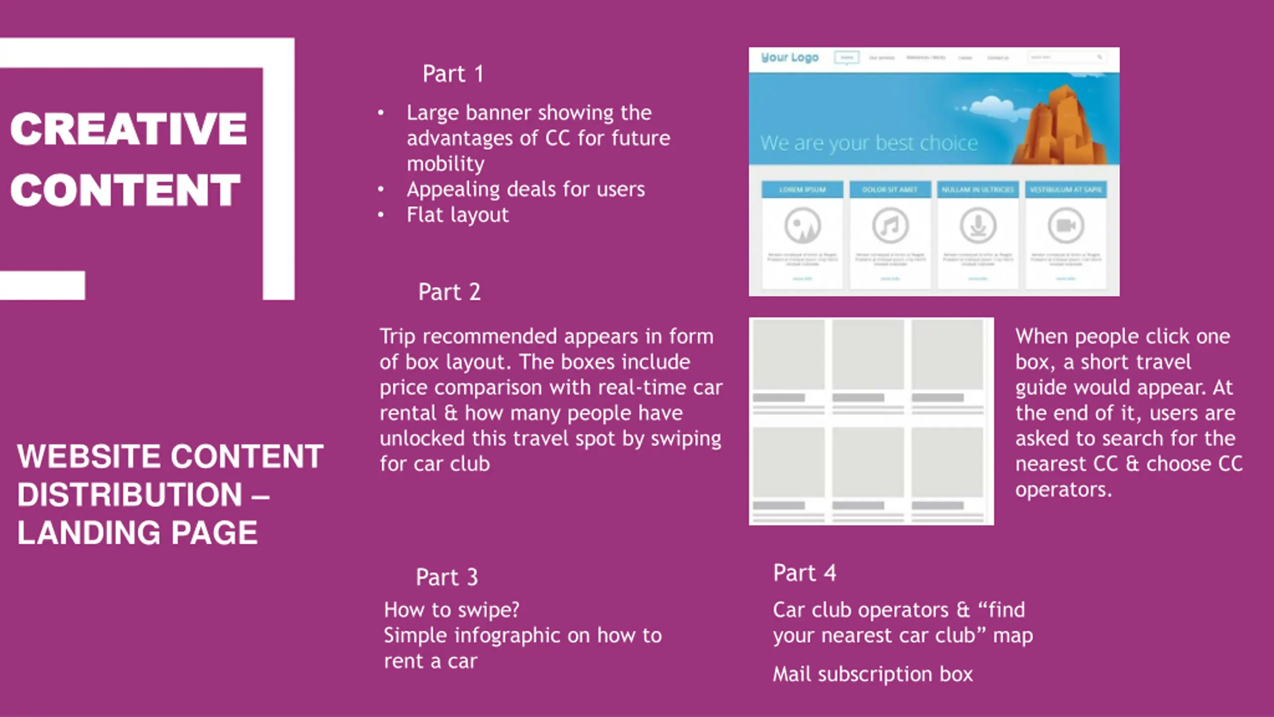 Part 1 CREATIVE CREATIVE CONTENT CONTENT Large banner showing the advantages of CC for future mobility Appealing deals for users Flat layout Part 2 Trip recommended appears in form of box layout. The boxes include price comparison with real-time car rental & how many people have unlocked this travel spot by swiping for car club When people click one box, a short travel guide would appear. At the end of it, users are asked to search for the nearest CC & choose CC operators. WEBSITE CONTENT DISTRIBUTION LANDING PAGE Part 4 Part 3 How to swipe? Simple infographic on how to rent a car Car club operators & find your nearest car club map Mail subscription box