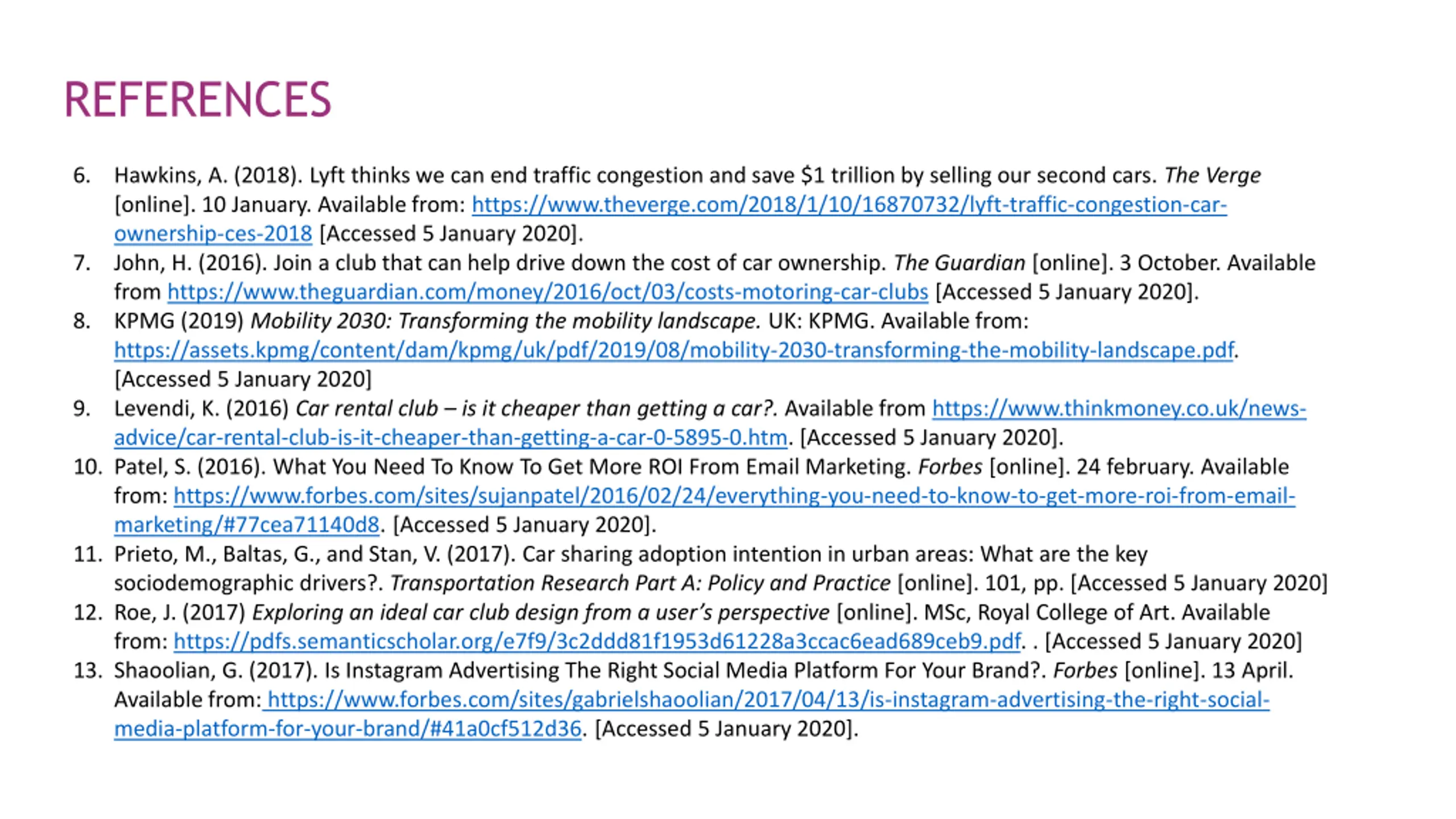 REFERENCES 6. Hawkins, A. (2018). Lyft thinks we can end traffic congestion and save $1 trillion by selling our second cars. The Verge [online]. 10 January. Available from: https://www.theverge.com/2018/1/10/16870732/lyft-traffic-congestion-car- ownership-ces-2018 [Accessed 5 January 2020]. John, H. (2016). Join a club that can help drive down the cost of car ownership. The Guardian [online]. 3 October. Available from https://www.theguardian.com/money/2016/oct/03/costs-motoring-car-clubs [Accessed 5 January 2020]. KPMG (2019) Mobility 2030: Transforming the mobility landscape. UK: KPMG. Available from: https://assets.kpmg/content/dam/kpmg/uk/pdf/2019/08/mobility-2030-transforming-the-mobility-landscape.pdf. [Accessed 5 January 2020] Levendi, K. (2016) Car rental club is it cheaper than getting a car?. Available from https://www.thinkmoney.co.uk/news- advice/car-rental-club-is-it-cheaper-than-getting-a-car-0-5895-0.htm. [Accessed 5 January 2020]. 10. Patel, S. (2016). What You Need To Know To Get More ROI From Email Marketing. Forbes [online]. 24 february. Available from: https://www.forbes.com/sites/sujanpatel/2016/02/24/everything-you-need-to-know-to-get-more-roi-from-email- marketing/#77cea71140d8. [Accessed 5 January 2020]. 11. Prieto, M., Baltas, G., and Stan, V. (2017). Car sharing adoption intention in urban areas: What are the key sociodemographic drivers?. Transportation Research Part A: Policy and Practice [online]. 101, pp. [Accessed 5 January 2020] 12. Roe, J. (2017) Exploring an ideal car club design from a user s perspective [online]. MSc, Royal College of Art. Available from: https://pdfs.semanticscholar.org/e7f9/3c2ddd81f1953d61228a3ccac6ead689ceb9.pdf. . [Accessed 5 January 2020] 13. Shaoolian, G. (2017). Is Instagram Advertising The Right Social Media Platform For Your Brand?. Forbes [online]. 13 April. Available from: https://www.forbes.com/sites/gabrielshaoolian/2017/04/13/is-instagram-advertising-the-right-social- media-platform-for-your-brand/#41a0cf512d36. [Accessed 5 January 2020]. 7. 8. 9.