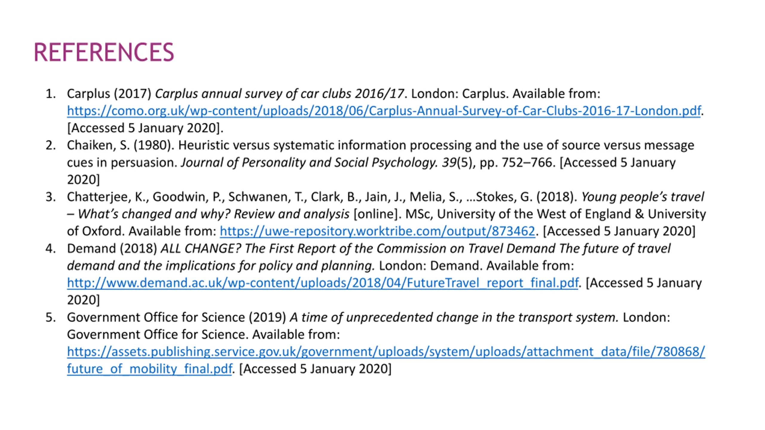 REFERENCES 1. Carplus (2017) Carplus annual survey of car clubs 2016/17. London: Carplus. Available from: https://como.org.uk/wp-content/uploads/2018/06/Carplus-Annual-Survey-of-Car-Clubs-2016-17-London.pdf. [Accessed 5 January 2020]. 2. Chaiken, S. (1980). Heuristic versus systematic information processing and the use of source versus message cues in persuasion. Journal of Personality and Social Psychology. 39(5), pp. 752 766. [Accessed 5 January 2020] 3. Chatterjee, K., Goodwin, P., Schwanen, T., Clark, B., Jain, J., Melia, S., Stokes, G. (2018). Young people s travel What s changed and why? Review and analysis [online]. MSc, University of the West of England & University of Oxford. Available from: https://uwe-repository.worktribe.com/output/873462. [Accessed 5 January 2020] 4. Demand (2018) ALL CHANGE? The First Report of the Commission on Travel Demand The future of travel demand and the implications for policy and planning. London: Demand. Available from: http://www.demand.ac.uk/wp-content/uploads/2018/04/FutureTravel_report_final.pdf. [Accessed 5 January 2020] 5. Government Office for Science (2019) A time of unprecedented change in the transport system. London: Government Office for Science. Available from: https://assets.publishing.service.gov.uk/government/uploads/system/uploads/attachment_data/file/780868/ future_of_mobility_final.pdf. [Accessed 5 January 2020]
