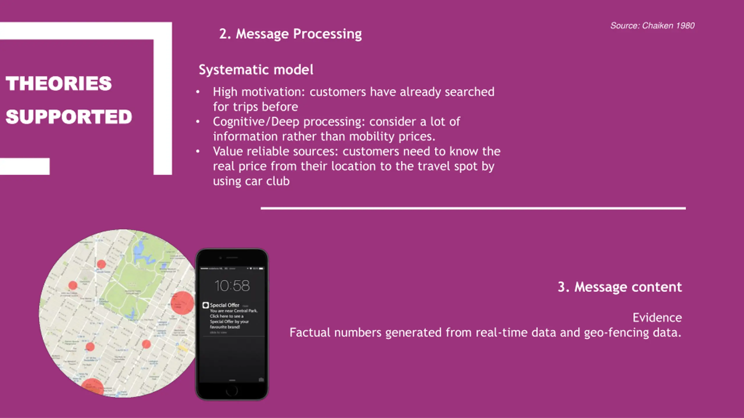 Source: Chaiken 1980 2. Message Processing Systematic model THEORIES THEORIES SUPPORTED SUPPORTED High motivation: customers have already searched for trips before Cognitive/Deep processing: consider a lot of information rather than mobility prices. Value reliable sources: customers need to know the real price from their location to the travel spot by using car club 3. Message content Evidence Factual numbers generated from real-time data and geo-fencing data.