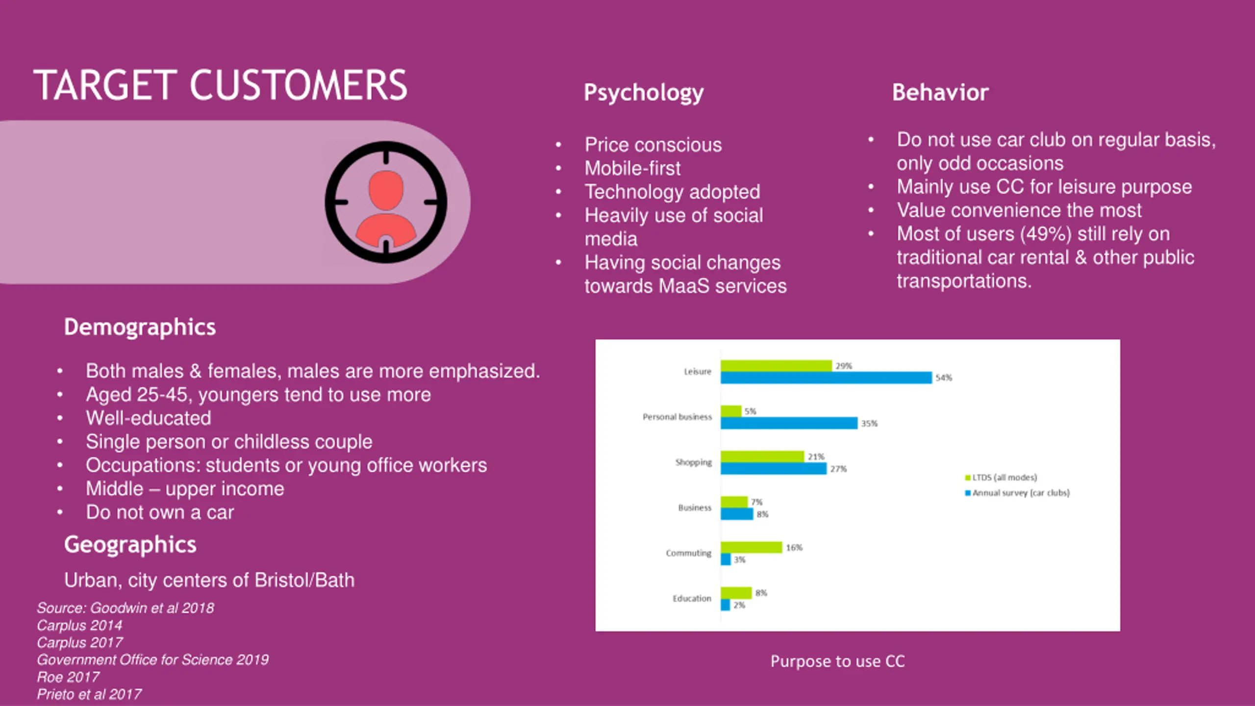 TARGET CUSTOMERS Psychology Behavior Do not use car club on regular basis, only odd occasions Mainly use CC for leisure purpose Value convenience the most Most of users (49%) still rely on traditional car rental & other public transportations. Price conscious Mobile-first Technology adopted Heavily use of social media Having social changes towards MaaS services Demographics Both males & females, males are more emphasized. Aged 25-45, youngers tend to use more Well-educated Single person or childless couple Occupations: students or young office workers Middle upper income Do not own a car Geographics Urban, city centers of Bristol/Bath Source: Goodwin et al 2018 Carplus 2014 Carplus 2017 Government Office for Science 2019 Roe 2017 Prieto et al 2017 Purpose to use CC