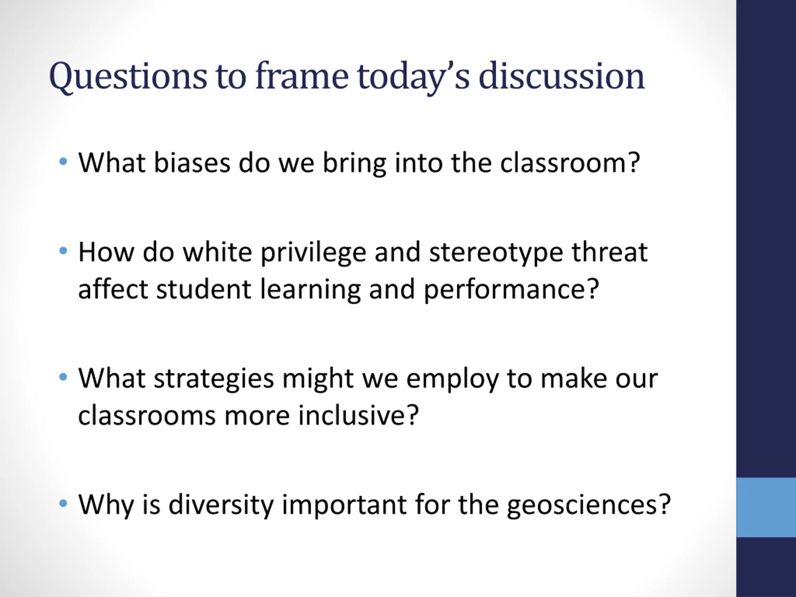 Questions to frame todays discussion What biases do we bring into the classroom? How do white privilege and stereotype threat affect student learning and performance? What strategies might we employ to make our classrooms more inclusive? Why is diversity important for the geosciences?