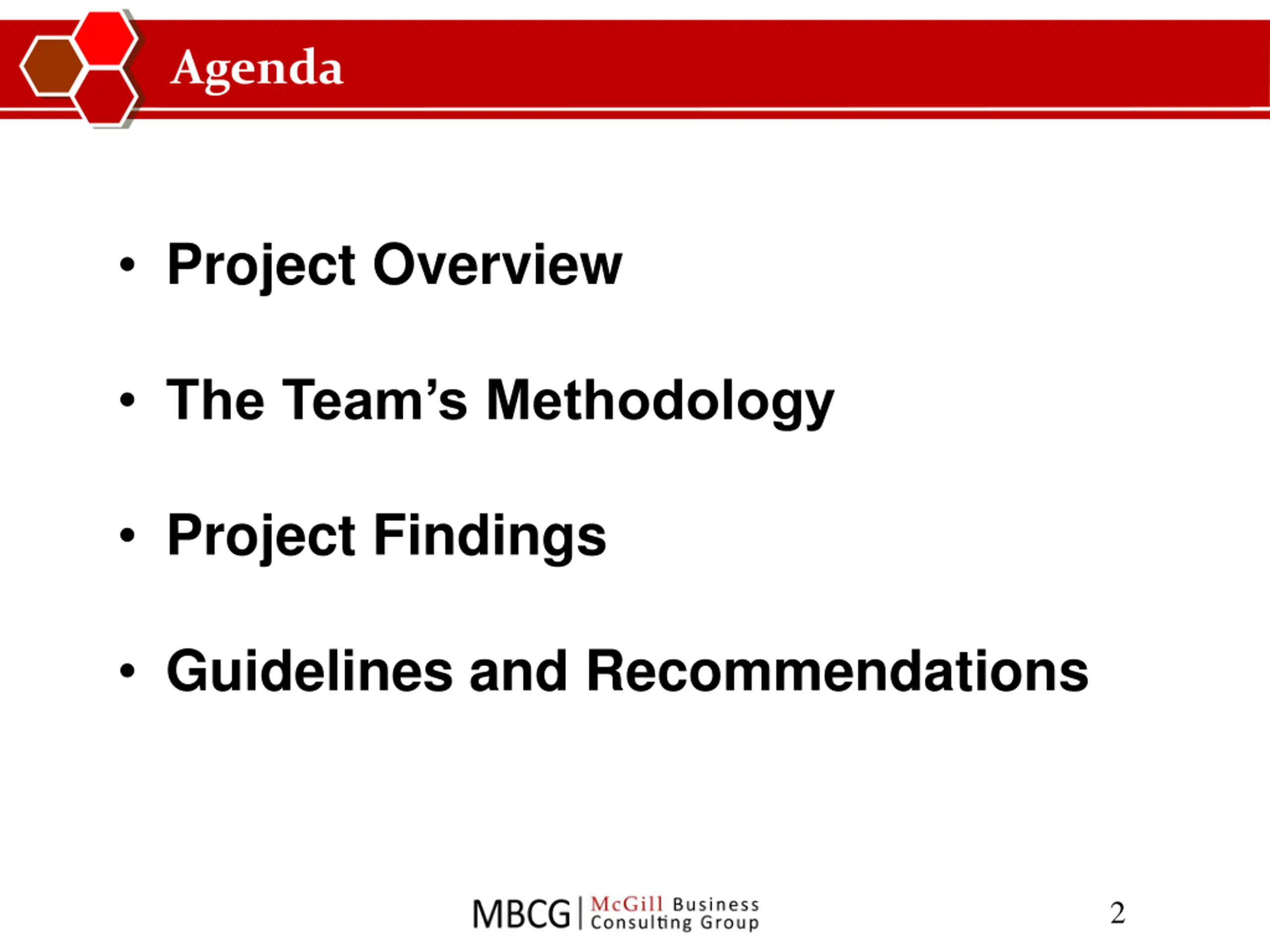 Agenda Project Overview The Team s Methodology Project Findings Guidelines and Recommendations 2