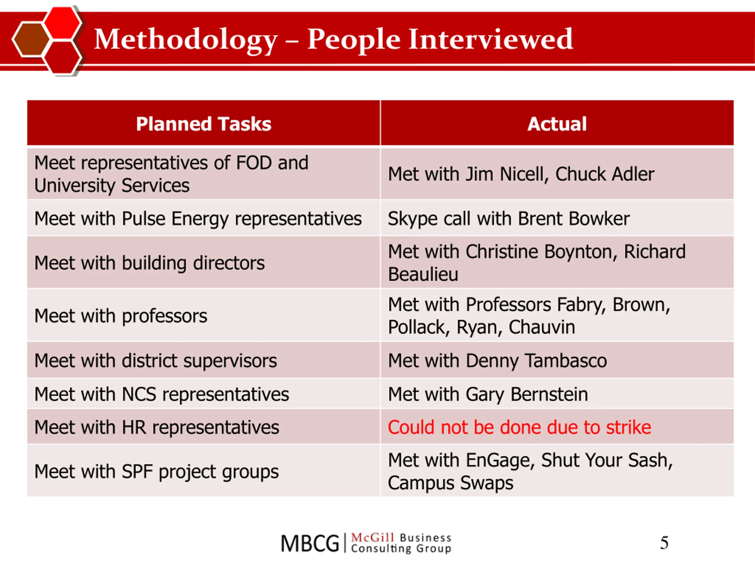 Methodology People Interviewed Planned Tasks Actual Meet representatives of FOD and University Services Met with Jim Nicell, Chuck Adler Meet with Pulse Energy representatives Skype call with Brent Bowker Met with Christine Boynton, Richard Beaulieu Met with Professors Fabry, Brown, Pollack, Ryan, Chauvin Meet with building directors Meet with professors Meet with district supervisors Met with Denny Tambasco Meet with NCS representatives Met with Gary Bernstein Meet with HR representatives Could not be done due to strike Met with EnGage, Shut Your Sash, Campus Swaps Meet with SPF project groups 5