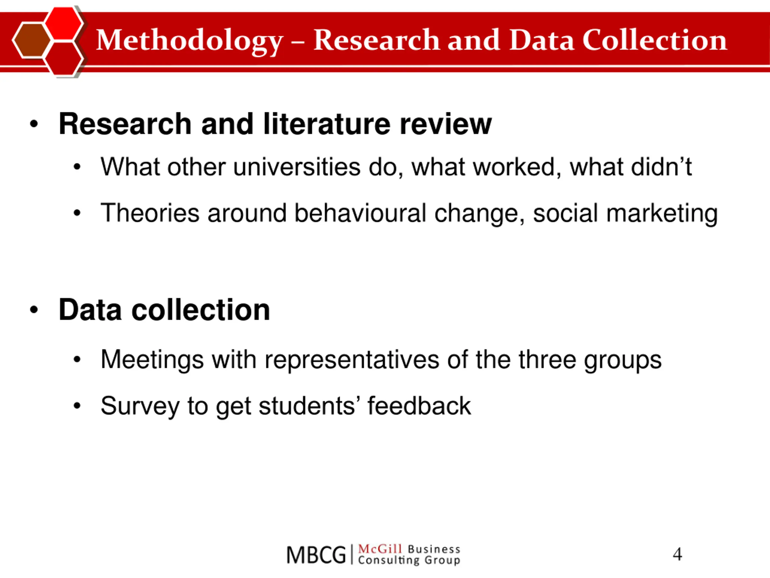 Methodology Research and Data Collection Research and literature review What other universities do, what worked, what didn t Theories around behavioural change, social marketing Data collection Meetings with representatives of the three groups Survey to get students feedback 4