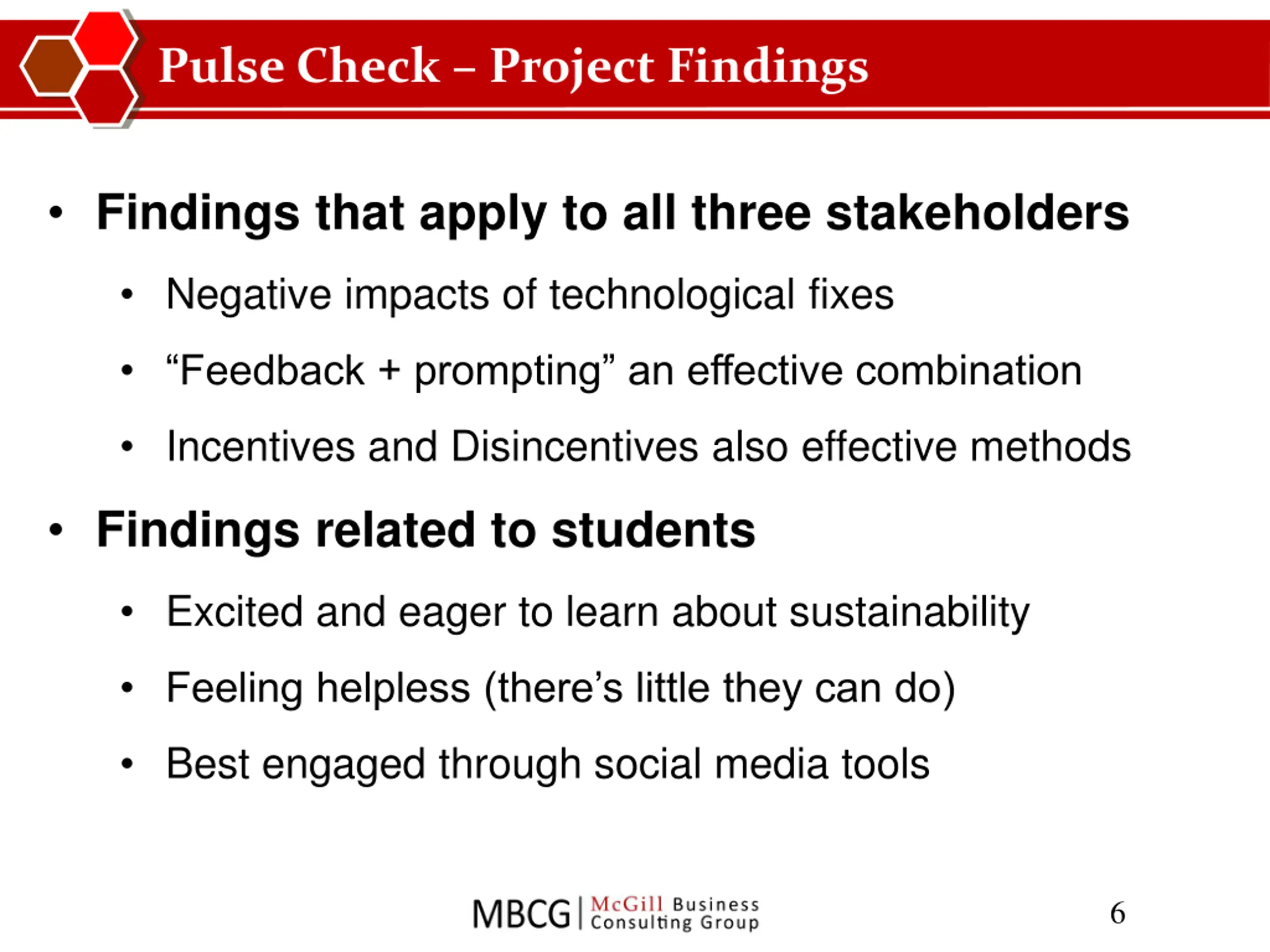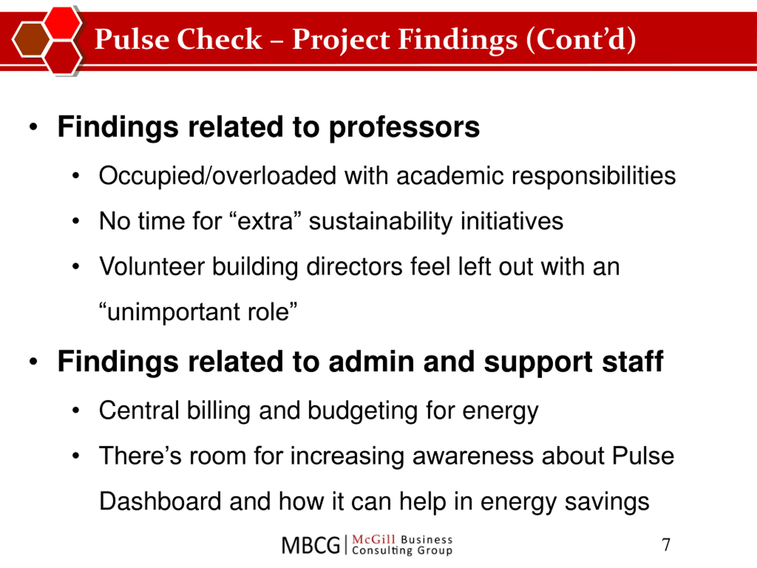 Promoting Energy-effective Practices at McGill Pulse Check McGill Business Consulting Group 1001 Sherbrooke St. West, Suite 361 Montr al, QC, Canada, H3A 1G5 Tel. (514) 398 5846 www.mbcg.com Wissam Shaar, Partner