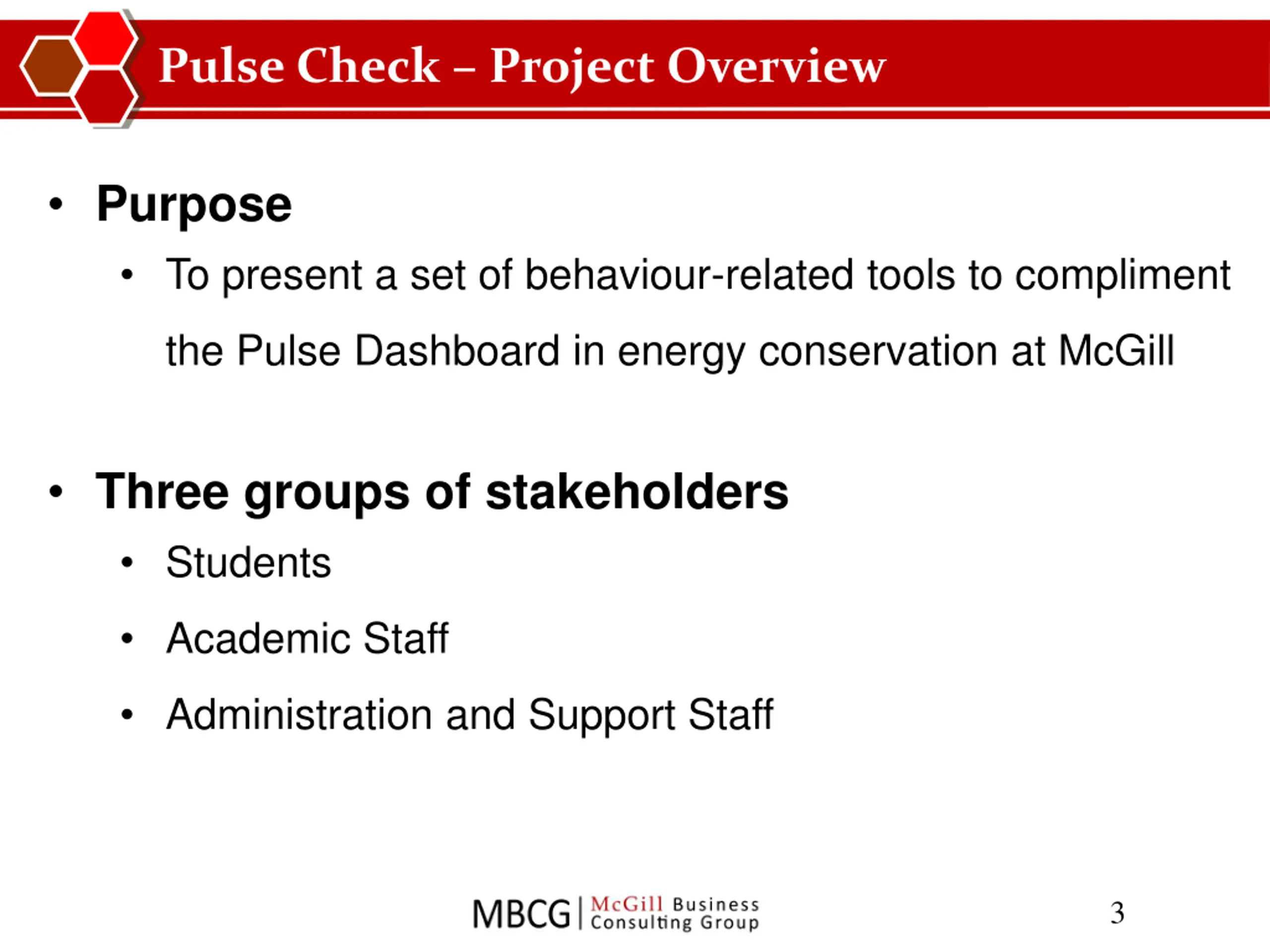 Pulse Check Project Overview Purpose To present a set of behaviour-related tools to compliment the Pulse Dashboard in energy conservation at McGill Three groups of stakeholders Students Academic Staff Administration and Support Staff 3