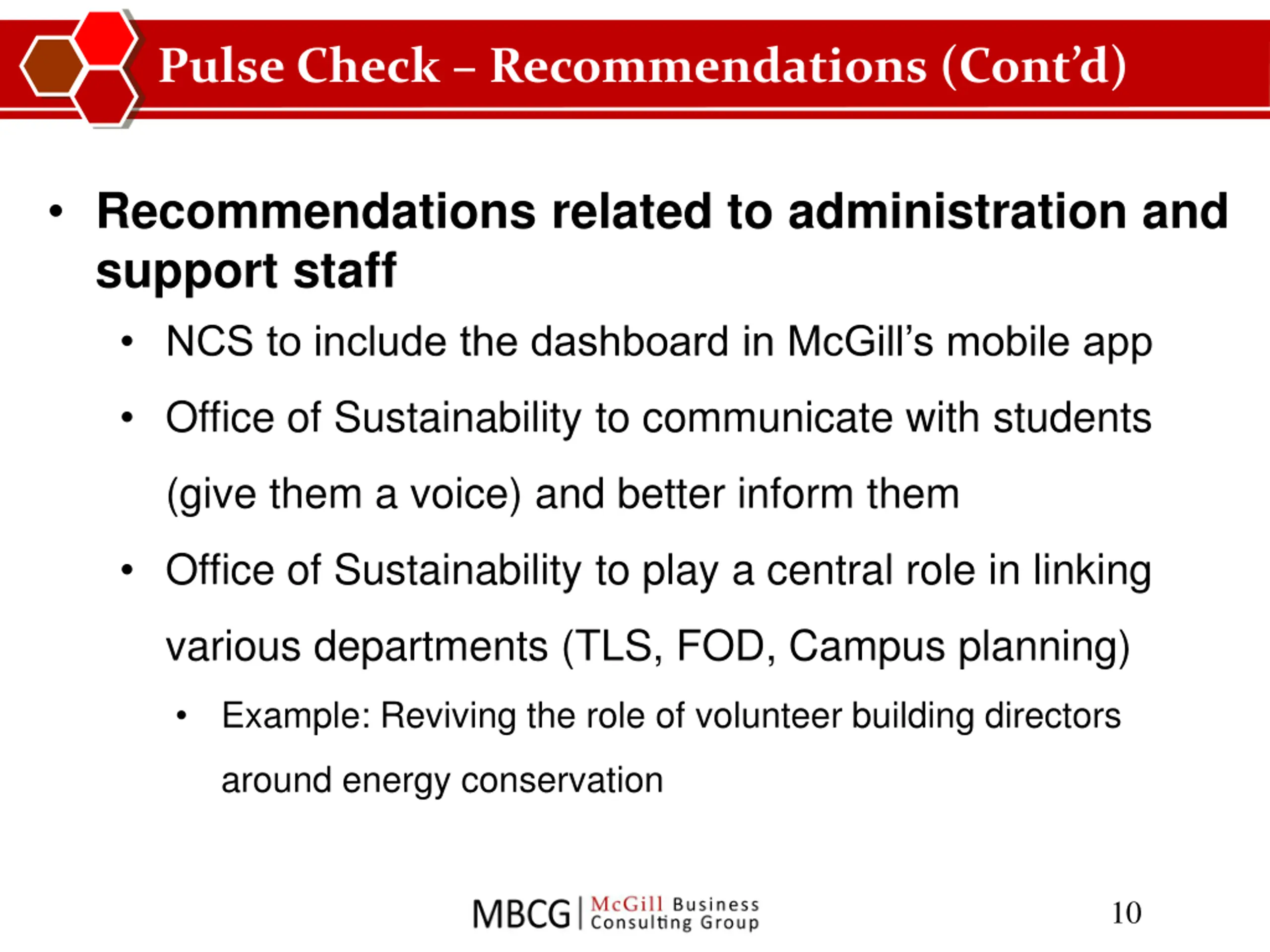 Pulse Check Recommendations (Contd) Recommendations related to administration and support staff NCS to include the dashboard in McGill s mobile app Office of Sustainability to communicate with students (give them a voice) and better inform them Office of Sustainability to play a central role in linking various departments (TLS, FOD, Campus planning) Example: Reviving the role of volunteer building directors around energy conservation 10