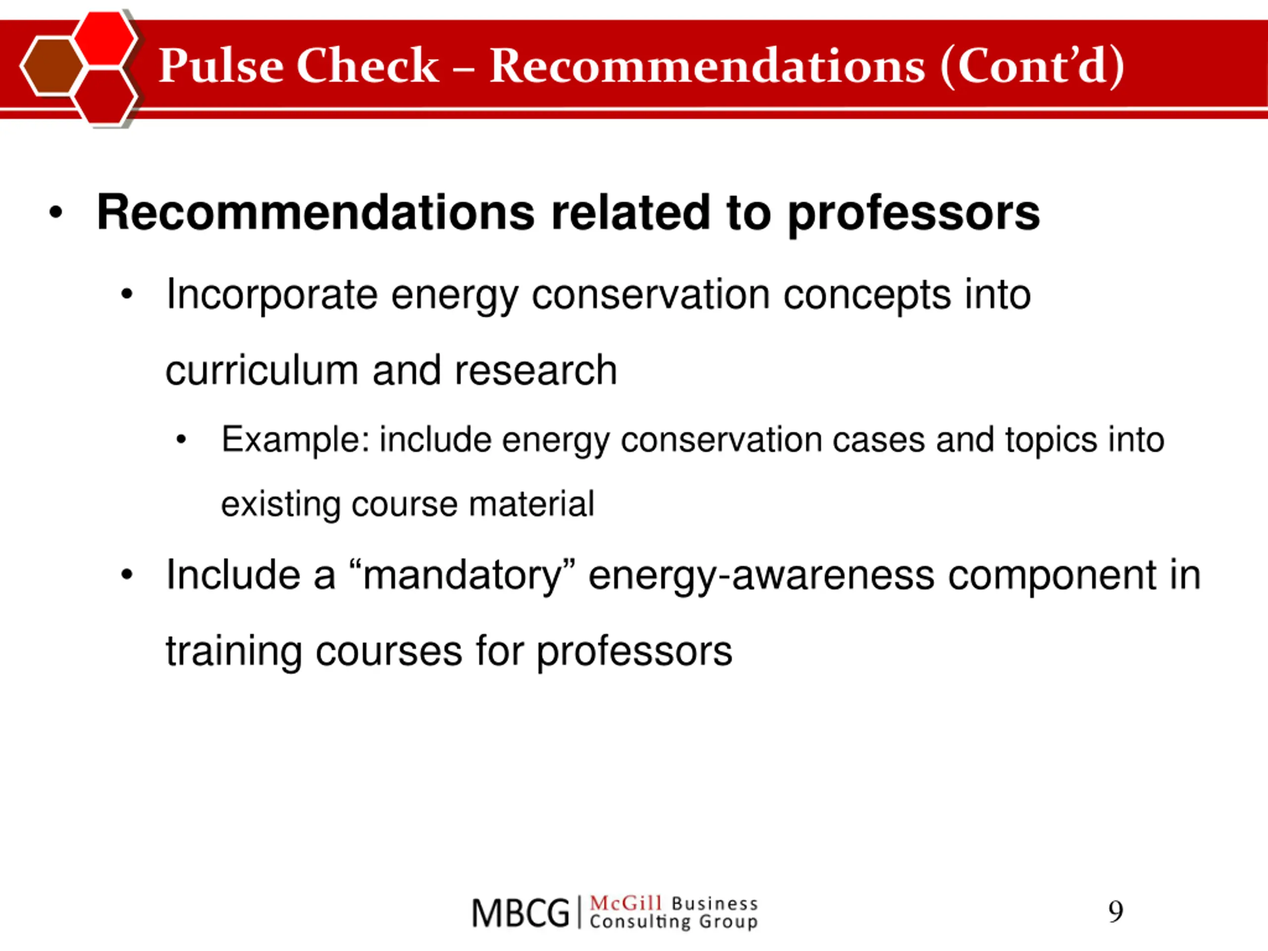Pulse Check Recommendations (Contd) Recommendations related to professors Incorporate energy conservation concepts into curriculum and research Example: include energy conservation cases and topics into existing course material Include a mandatory energy-awareness component in training courses for professors 9
