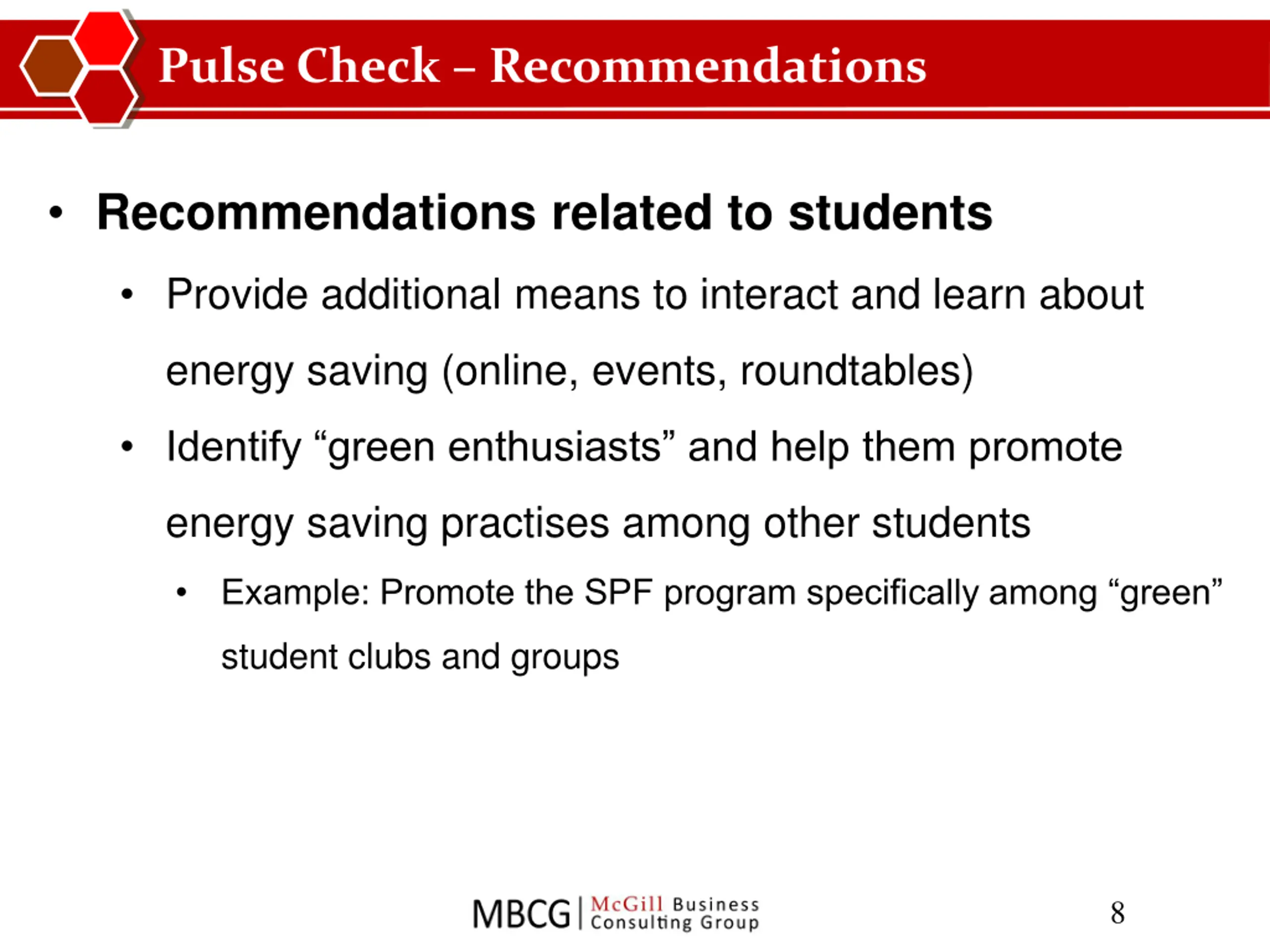 Pulse Check Recommendations Recommendations related to students Provide additional means to interact and learn about energy saving (online, events, roundtables) Identify green enthusiasts and help them promote energy saving practises among other students Example: Promote the SPF program specifically among green student clubs and groups 8