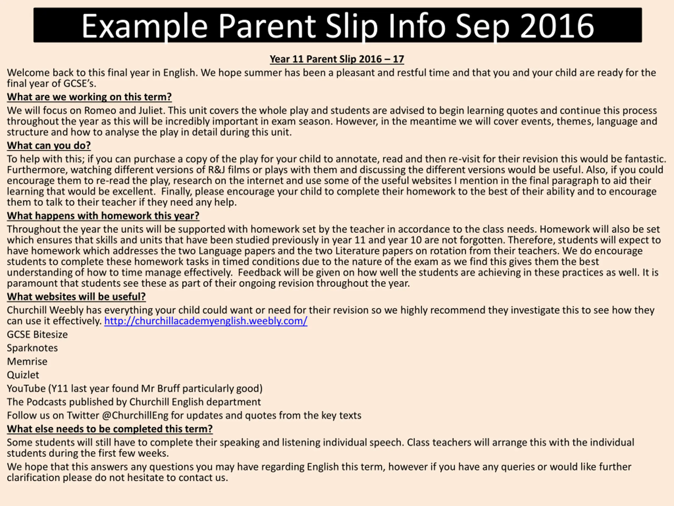 Example Parent Slip Info Sep 2016 Year 11 Parent Slip 2016 17 Welcome back to this final year in English. We hope summer has been a pleasant and restful time and that you and your child are ready for the final year of GCSE s. What are we working on this term? We will focus on Romeo and Juliet. This unit covers the whole play and students are advised to begin learning quotes and continue this process throughout the year as this will be incredibly important in exam season. However, in the meantime we will cover events, themes, language and structure and how to analyse the play in detail during this unit. What can you do? To help with this; if you can purchase a copy of the play for your child to annotate, read and then re-visit for their revision this would be fantastic. Furthermore, watching different versions of R&J films or plays with them and discussing the different versions would be useful. Also, if you could encourage them to re-read the play, research on the internet and use some of the useful websites I mention in the final paragraph to aid their learning that would be excellent. Finally, please encourage your child to complete their homework to the best of their ability and to encourage them to talk to their teacher if they need any help. What happens with homework this year? Throughout the year the units will be supported with homework set by the teacher in accordance to the class needs. Homework will also be set which ensures that skills and units that have been studied previously in year 11 and year 10 are not forgotten. Therefore, students will expect to have homework which addresses the two Language papers and the two Literature papers on rotation from their teachers. We do encourage students to complete these homework tasks in timed conditions due to the nature of the exam as we find this gives them the best understanding of how to time manage effectively. Feedback will be given on how well the students are achieving in these practices as well. It is paramount that students see these as part of their ongoing revision throughout the year. What websites will be useful? Churchill Weebly has everything your child could want or need for their revision so we highly recommend they investigate this to see how they can use it effectively. http://churchillacademyenglish.weebly.com/ GCSE Bitesize Sparknotes Memrise Quizlet YouTube (Y11 last year found Mr Bruff particularly good) The Podcasts published by Churchill English department Follow us on Twitter @ChurchillEng for updates and quotes from the key texts What else needs to be completed this term? Some students will still have to complete their speaking and listening individual speech. Class teachers will arrange this with the individual students during the first few weeks. We hope that this answers any questions you may have regarding English this term, however if you have any queries or would like further clarification please do not hesitate to contact us.