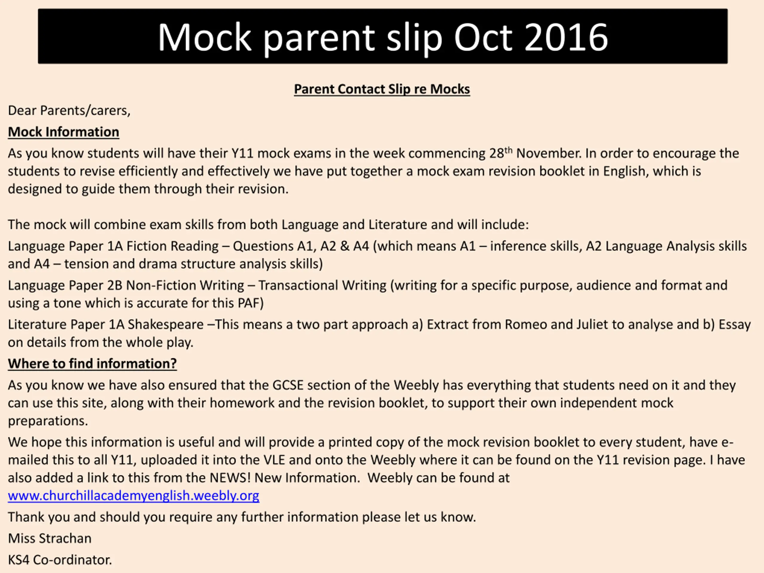 Mock parent slip Oct 2016 Parent Contact Slip re Mocks Dear Parents/carers, Mock Information As you know students will have their Y11 mock exams in the week commencing 28th November. In order to encourage the students to revise efficiently and effectively we have put together a mock exam revision booklet in English, which is designed to guide them through their revision. The mock will combine exam skills from both Language and Literature and will include: Language Paper 1A Fiction Reading Questions A1, A2 & A4 (which means A1 inference skills, A2 Language Analysis skills and A4 tension and drama structure analysis skills) Language Paper 2B Non-Fiction Writing Transactional Writing (writing for a specific purpose, audience and format and using a tone which is accurate for this PAF) Literature Paper 1A Shakespeare This means a two part approach a) Extract from Romeo and Juliet to analyse and b) Essay on details from the whole play. Where to find information? As you know we have also ensured that the GCSE section of the Weebly has everything that students need on it and they can use this site, along with their homework and the revision booklet, to support their own independent mock preparations. We hope this information is useful and will provide a printed copy of the mock revision booklet to every student, have e- mailed this to all Y11, uploaded it into the VLE and onto the Weebly where it can be found on the Y11 revision page. I have also added a link to this from the NEWS! New Information. Weebly can be found at www.churchillacademyenglish.weebly.org Thank you and should you require any further information please let us know. Miss Strachan KS4 Co-ordinator.