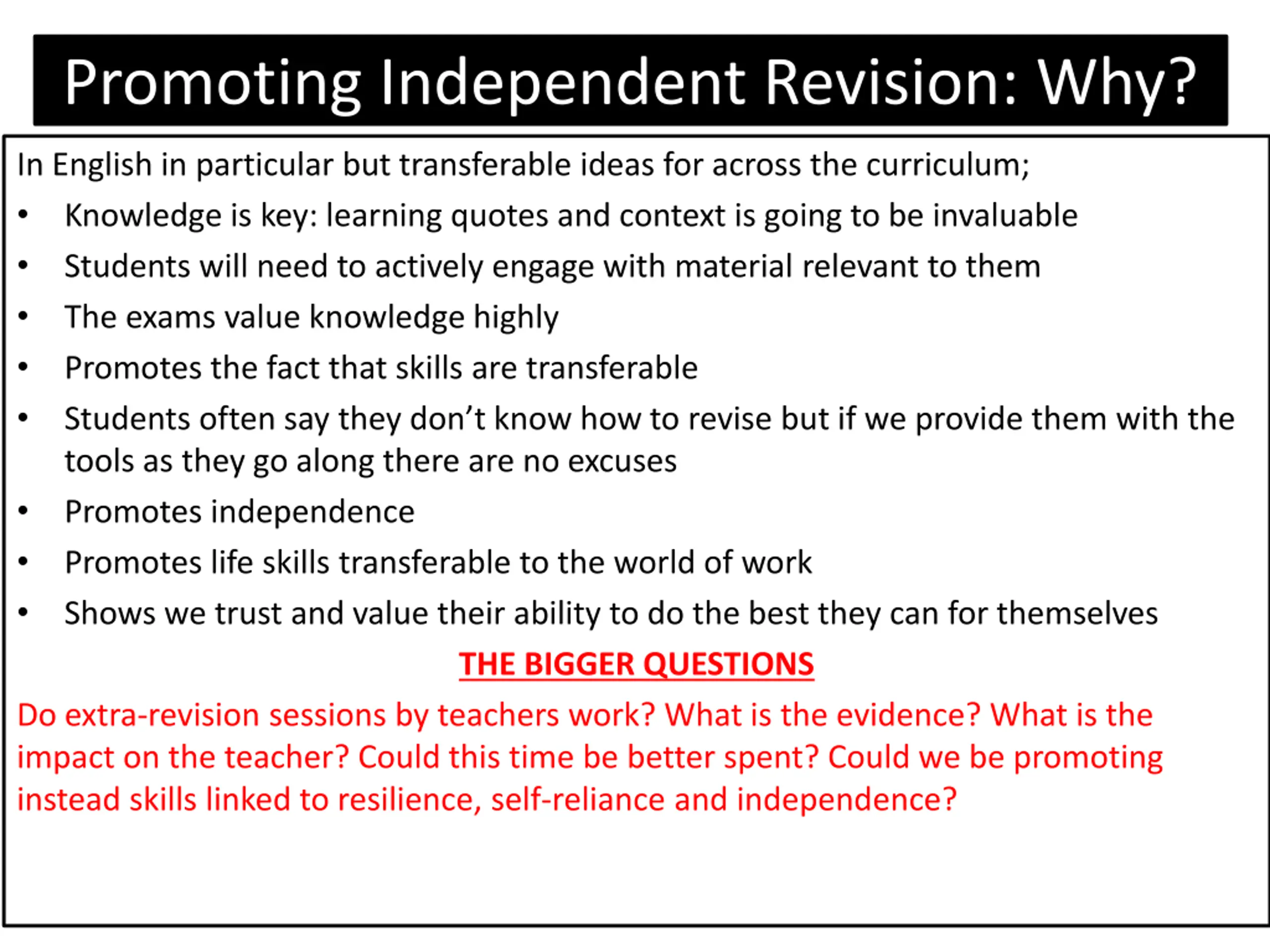 Promoting Independent Revision: Why? In English in particular but transferable ideas for across the curriculum; Knowledge is key: learning quotes and context is going to be invaluable Students will need to actively engage with material relevant to them The exams value knowledge highly Promotes the fact that skills are transferable Students often say they don t know how to revise but if we provide them with the tools as they go along there are no excuses Promotes independence Promotes life skills transferable to the world of work Shows we trust and value their ability to do the best they can for themselves THE BIGGER QUESTIONS Do extra-revision sessions by teachers work? What is the evidence? What is the impact on the teacher? Could this time be better spent? Could we be promoting instead skills linked to resilience, self-reliance and independence?