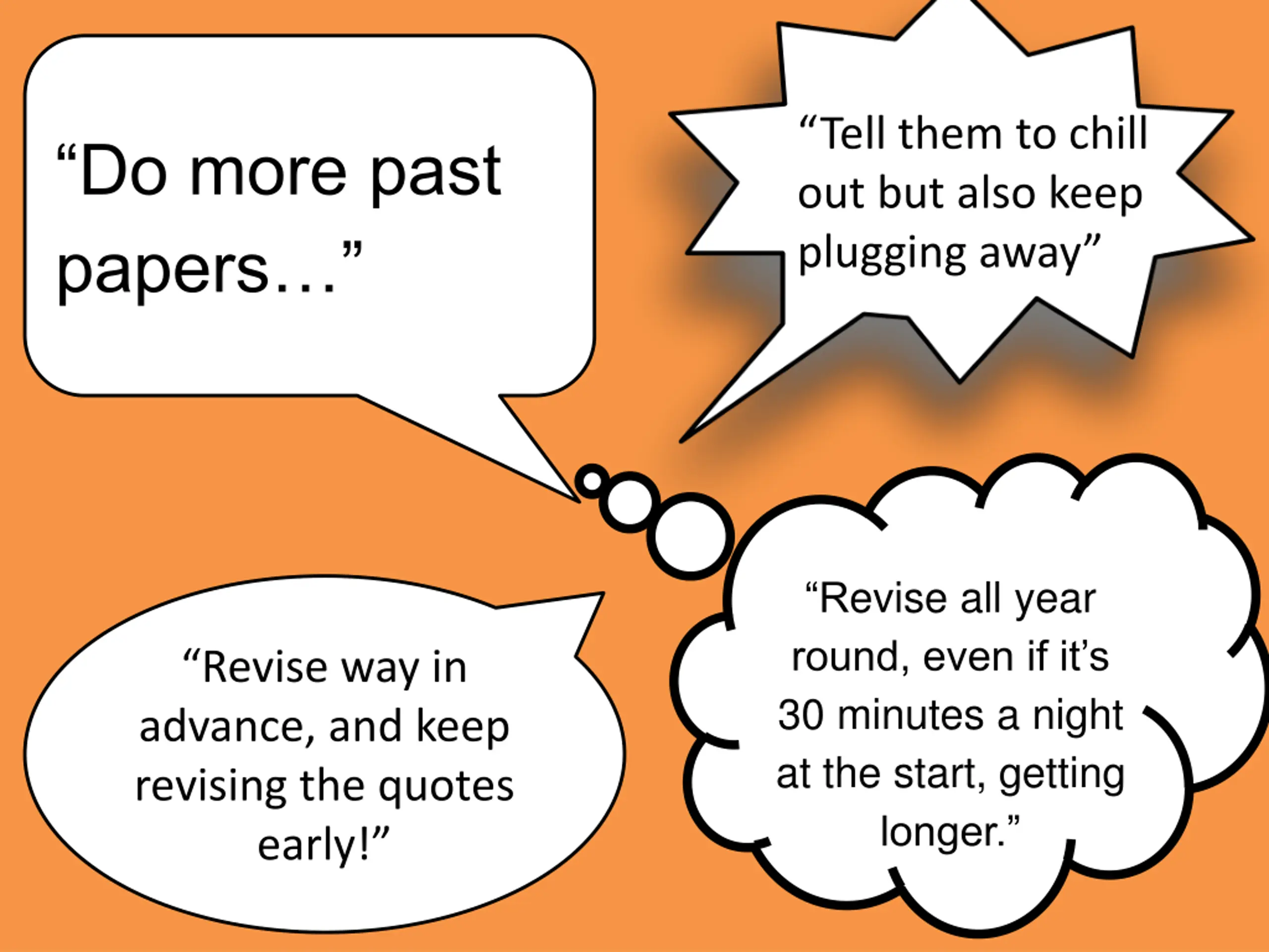 Tell them to chill out but also keep plugging away Do more past papers Revise all year round, even if it s 30 minutes a night at the start, getting longer. Revise way in advance, and keep revising the quotes early!