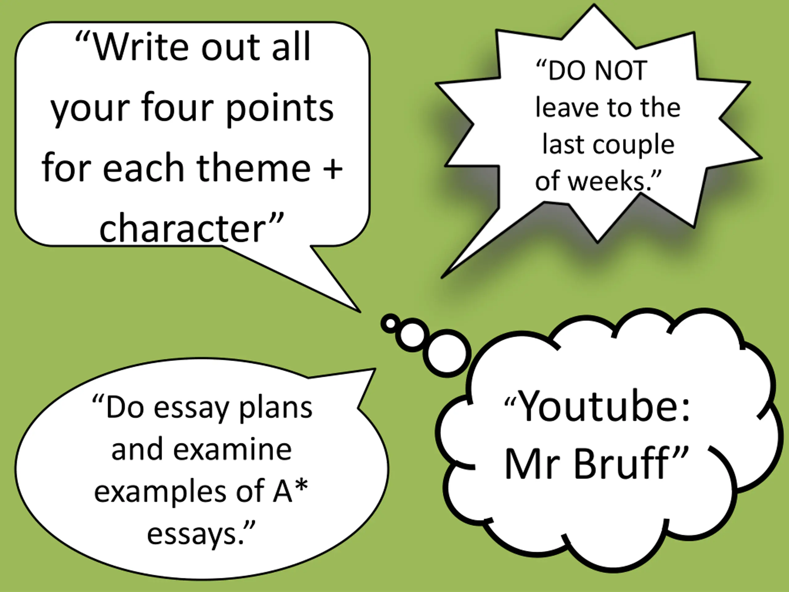 Write out all your four points for each theme + character DO NOT leave to the last couple of weeks. Youtube: Mr Bruff Do essay plans and examine examples of A* essays.