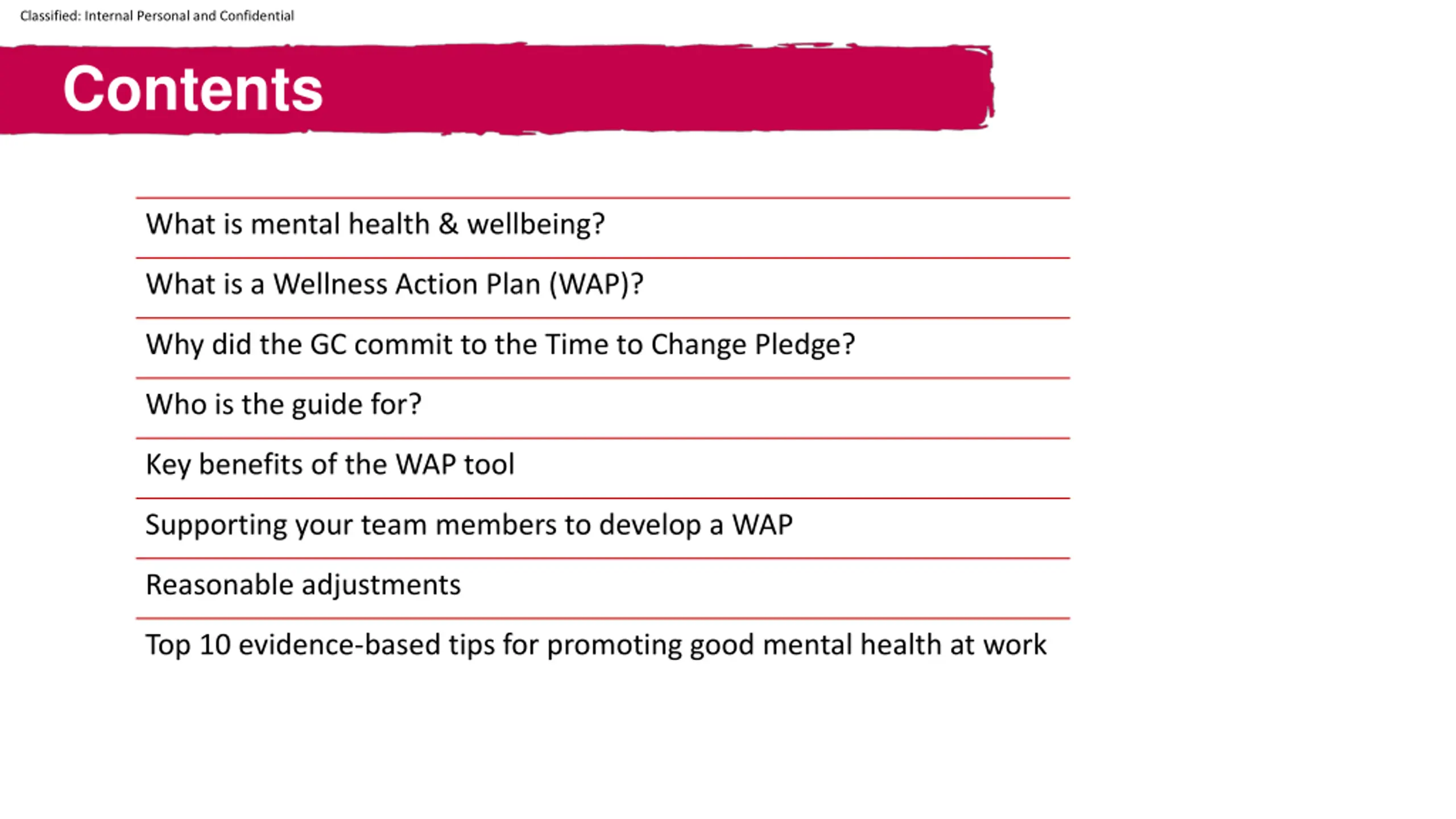 Classified: Internal Personal and Confidential Contents What is mental health & wellbeing? What is a Wellness Action Plan (WAP)? Why did the GC commit to the Time to Change Pledge? Who is the guide for? Key benefits of the WAP tool Supporting your team members to develop a WAP Reasonable adjustments Top 10 evidence-based tips for promoting good mental health at work