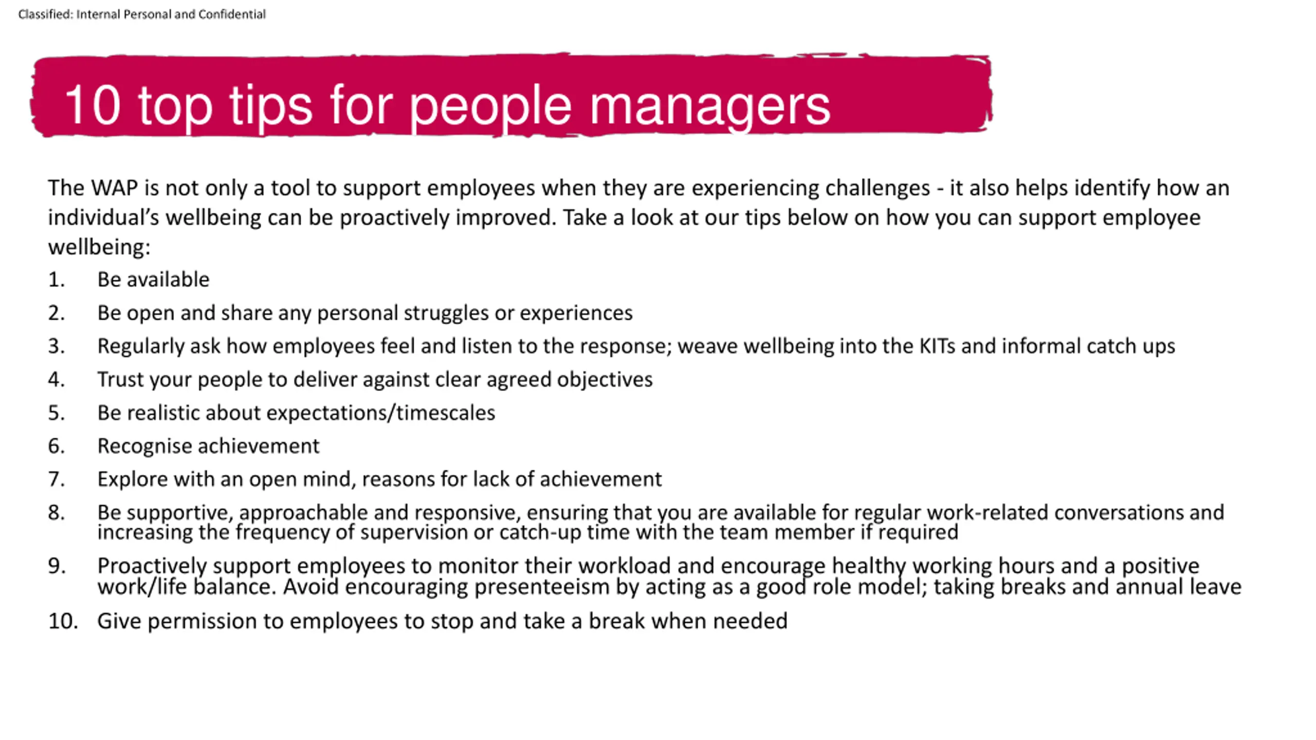 Classified: Internal Personal and Confidential 10 top tips for people managers The WAP is not only a tool to support employees when they are experiencing challenges - it also helps identify how an individual s wellbeing can be proactively improved. Take a look at our tips below on how you can support employee wellbeing: 1. 2. 3. 4. 5. 6. 7. 8. Be available Be open and share any personal struggles or experiences Regularly ask how employees feel and listen to the response; weave wellbeing into the KITs and informal catch ups Trust your people to deliver against clear agreed objectives Be realistic about expectations/timescales Recognise achievement Explore with an open mind, reasons for lack of achievement Be supportive, approachable and responsive, ensuring that you are available for regular work-related conversations and increasing the frequency of supervision or catch-up time with the team member if required Proactively support employees to monitor their workload and encourage healthy working hours and a positive work/life balance. Avoid encouraging presenteeism by acting as a good role model; taking breaks and annual leave 10. Give permission to employees to stop and take a break when needed 9.