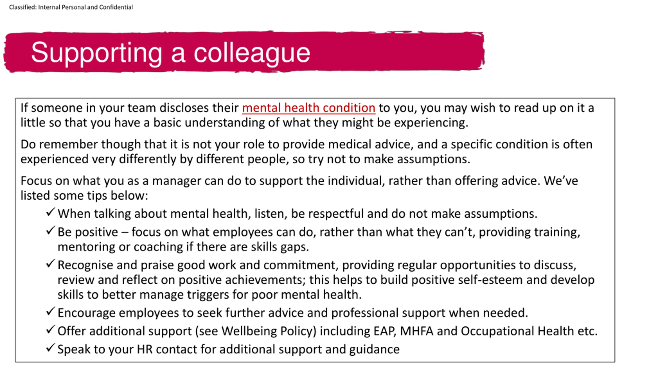 Classified: Internal Personal and Confidential Supporting a colleague If someone in your team discloses their mental health condition to you, you may wish to read up on it a little so that you have a basic understanding of what they might be experiencing. Do remember though that it is not your role to provide medical advice, and a specific condition is often experienced very differently by different people, so try not to make assumptions. Focus on what you as a manager can do to support the individual, rather than offering advice. We ve listed some tips below: When talking about mental health, listen, be respectful and do not make assumptions. Be positive focus on what employees can do, rather than what they can t, providing training, mentoring or coaching if there are skills gaps. Recognise and praise good work and commitment, providing regular opportunities to discuss, review and reflect on positive achievements; this helps to build positive self-esteem and develop skills to better manage triggers for poor mental health. Encourage employees to seek further advice and professional support when needed. Offer additional support (see Wellbeing Policy) including EAP, MHFA and Occupational Health etc. Speak to your HR contact for additional support and guidance