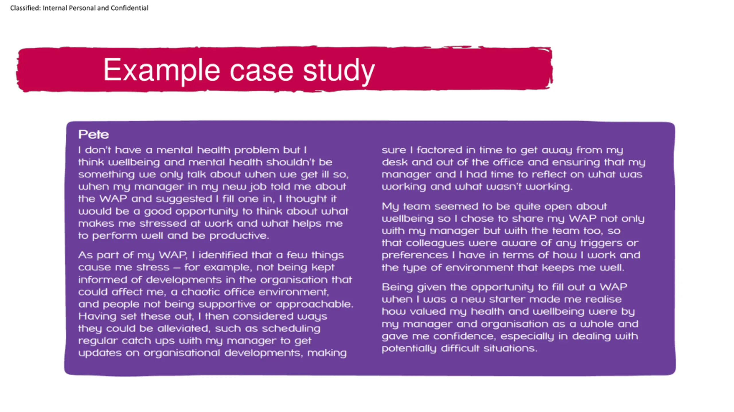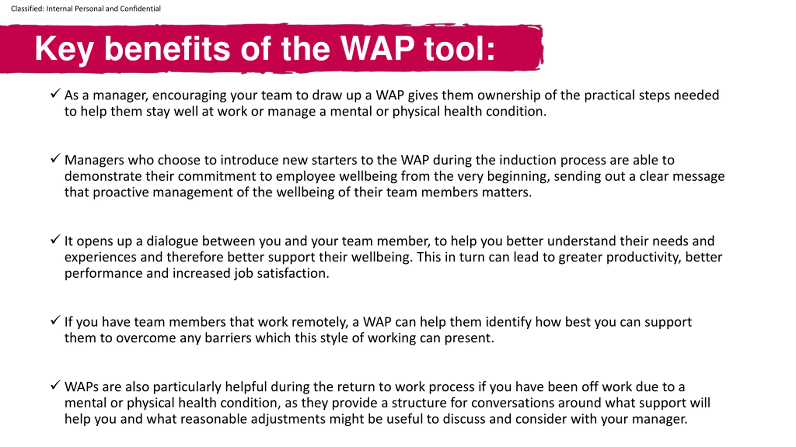 Classified: Internal Personal and Confidential Key benefits of the WAP tool: As a manager, encouraging your team to draw up a WAP gives them ownership of the practical steps needed to help them stay well at work or manage a mental or physical health condition. Managers who choose to introduce new starters to the WAP during the induction process are able to demonstrate their commitment to employee wellbeing from the very beginning, sending out a clear message that proactive management of the wellbeing of their team members matters. It opens up a dialogue between you and your team member, to help you better understand their needs and experiences and therefore better support their wellbeing. This in turn can lead to greater productivity, better performance and increased job satisfaction. If you have team members that work remotely, a WAP can help them identify how best you can support them to overcome any barriers which this style of working can present. WAPs are also particularly helpful during the return to work process if you have been off work due to a mental or physical health condition, as they provide a structure for conversations around what support will help you and what reasonable adjustments might be useful to discuss and consider with your manager.
