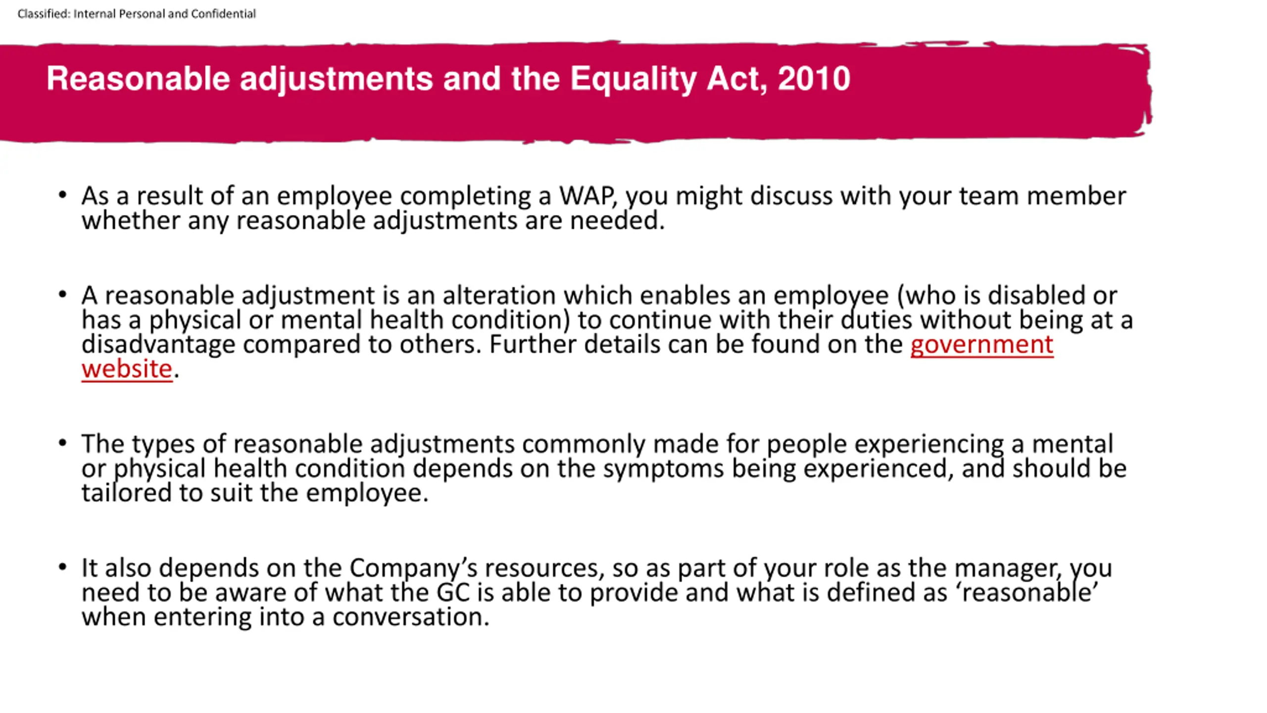 Classified: Internal Personal and Confidential Reasonable adjustments and the Equality Act, 2010 As a result of an employee completing a WAP, you might discuss with your team member whether any reasonable adjustments are needed. A reasonable adjustment is an alteration which enables an employee (who is disabled or has a physical or mental health condition) to continue with their duties without being at a disadvantage compared to others. Further details can be found on the government website. The types of reasonable adjustments commonly made for people experiencing a mental or physical health condition depends on the symptoms being experienced, and should be tailored to suit the employee. It also depends on the Company s resources, so as part of your role as the manager, you need to be aware of what the GC is able to provide and what is defined as reasonable when entering into a conversation.