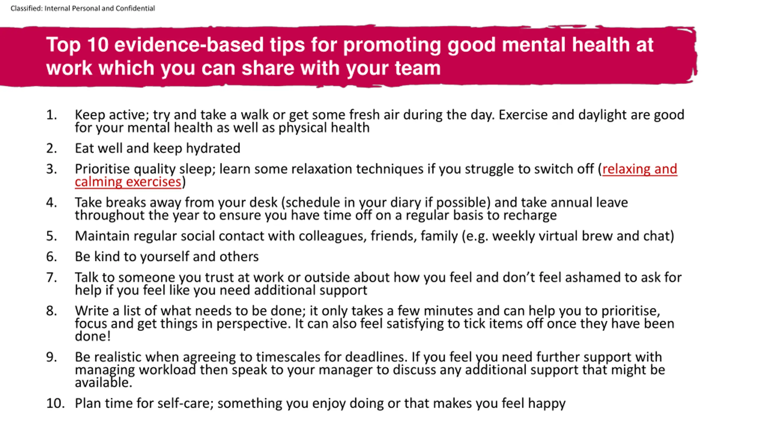 Classified: Internal Personal and Confidential Top 10 evidence-based tips for promoting good mental health at work which you can share with your team 1. Keep active; try and take a walk or get some fresh air during the day. Exercise and daylight are good for your mental health as well as physical health Eat well and keep hydrated Prioritise quality sleep; learn some relaxation techniques if you struggle to switch off (relaxing and calming exercises) Take breaks away from your desk (schedule in your diary if possible) and take annual leave throughout the year to ensure you have time off on a regular basis to recharge Maintain regular social contact with colleagues, friends, family (e.g. weekly virtual brew and chat) Be kind to yourself and others Talk to someone you trust at work or outside about how you feel and don t feel ashamed to ask for help if you feel like you need additional support Write a list of what needs to be done; it only takes a few minutes and can help you to prioritise, focus and get things in perspective. It can also feel satisfying to tick items off once they have been done! Be realistic when agreeing to timescales for deadlines. If you feel you need further support with managing workload then speak to your manager to discuss any additional support that might be available. 10. Plan time for self-care; something you enjoy doing or that makes you feel happy 2. 3. 4. 5. 6. 7. 8. 9.