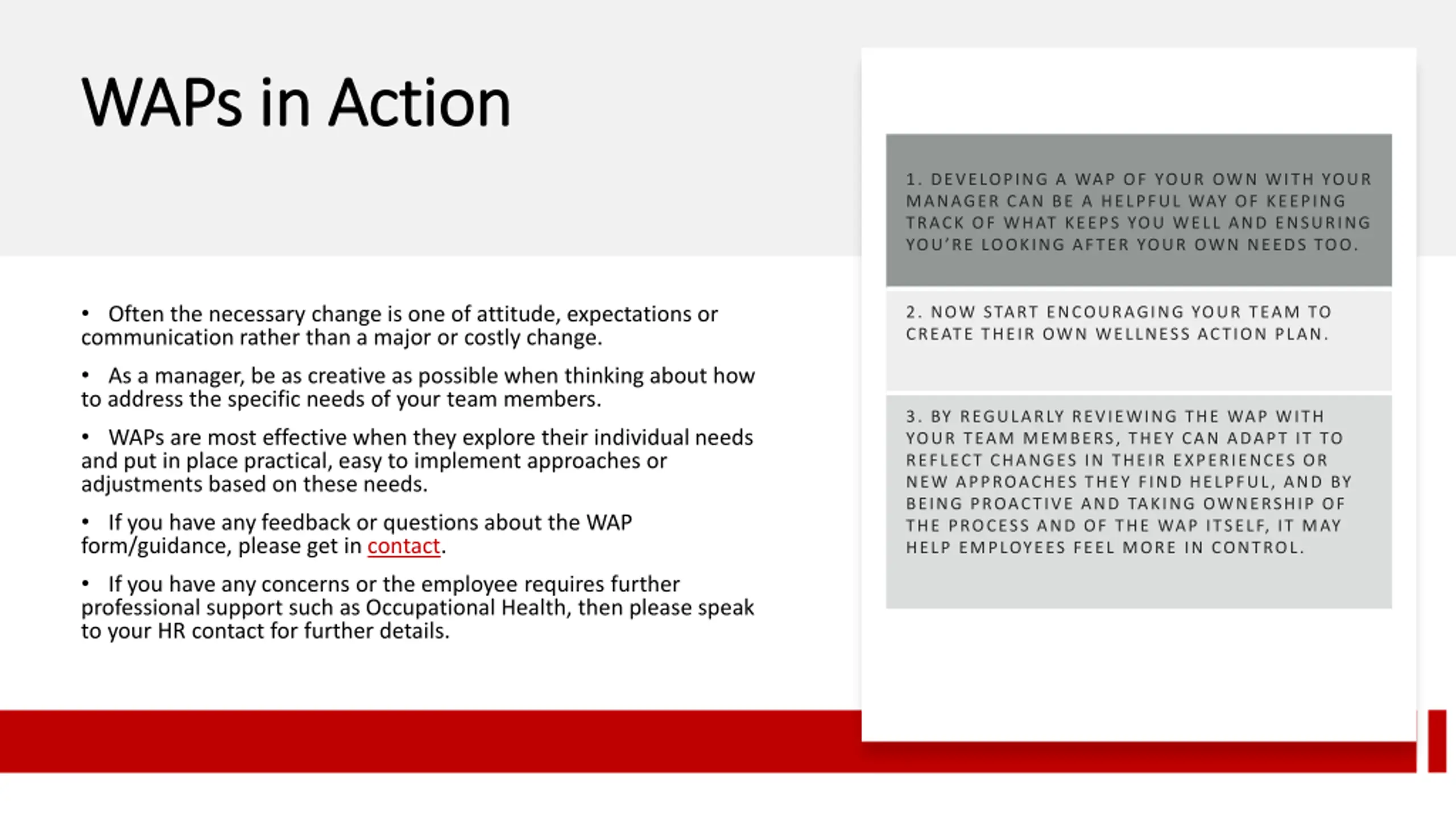 Classified: Internal Personal and Confidential WAPs in Action WAPs in Action 1. DEVELOPING A WAP OF YOUR OWN WITH YOUR MANAGER CAN BE A HELPFUL WAY OF KEEPING TRACK OF WHAT KEEPS YOU WELL AND ENSURING YOU RE LOOKING AFTER YOUR OWN NEEDS TOO. Often the necessary change is one of attitude, expectations or communication rather than a major or costly change. As a manager, be as creative as possible when thinking about how to address the specific needs of your team members. WAPs are most effective when they explore their individual needs and put in place practical, easy to implement approaches or adjustments based on these needs. If you have any feedback or questions about the WAP form/guidance, please get in contact. If you have any concerns or the employee requires further professional support such as Occupational Health, then please speak to your HR contact for further details. 2. NOW START ENCOURAGING YOUR TEAM TO CREATE THEIR OWN WELLNESS ACTION PLAN. 3. BY REGULARLY REVIEWING THE WAP WITH YOUR TEAM MEMBERS, THEY CAN ADAPT IT TO REFLECT CHANGES IN THEIR EXPERIENCES OR NEW APPROACHES THEY FIND HELPFUL, AND BY BEING PROACTIVE AND TAKING OWNERSHIP OF THE PROCESS AND OF THE WAP ITSELF, IT MAY HELP EMPLOYEES FEEL MORE IN CONTROL.