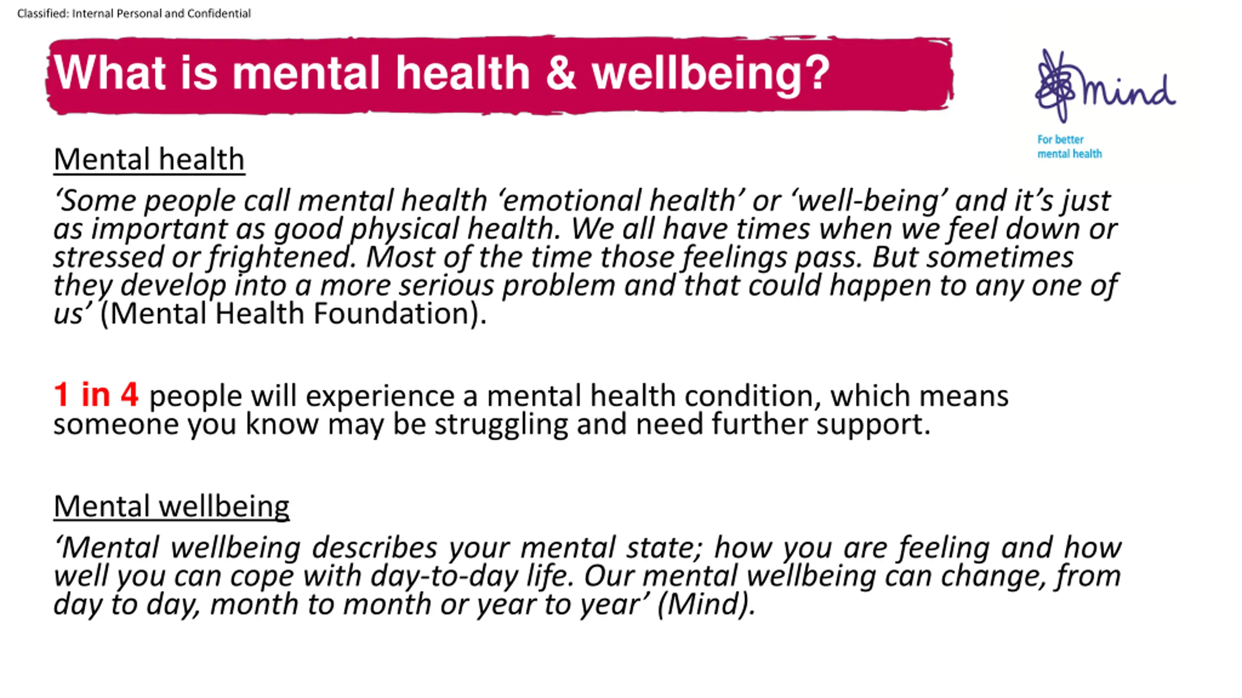 Classified: Internal Personal and Confidential What is mental health & wellbeing? Mental health Some people call mental health emotional health or well-being and it s just as important as good physical health. We all have times when we feel down or stressed or frightened. Most of the time those feelings pass. But sometimes they develop into a more serious problem and that could happen to any one of us (Mental Health Foundation). 1 in 4 people will experience a mental health condition, which means someone you know may be struggling and need further support. Mental wellbeing Mental wellbeing describes your mental state; how you are feeling and how well you can cope with day-to-day life. Our mental wellbeing can change, from day to day, month to month or year to year (Mind).
