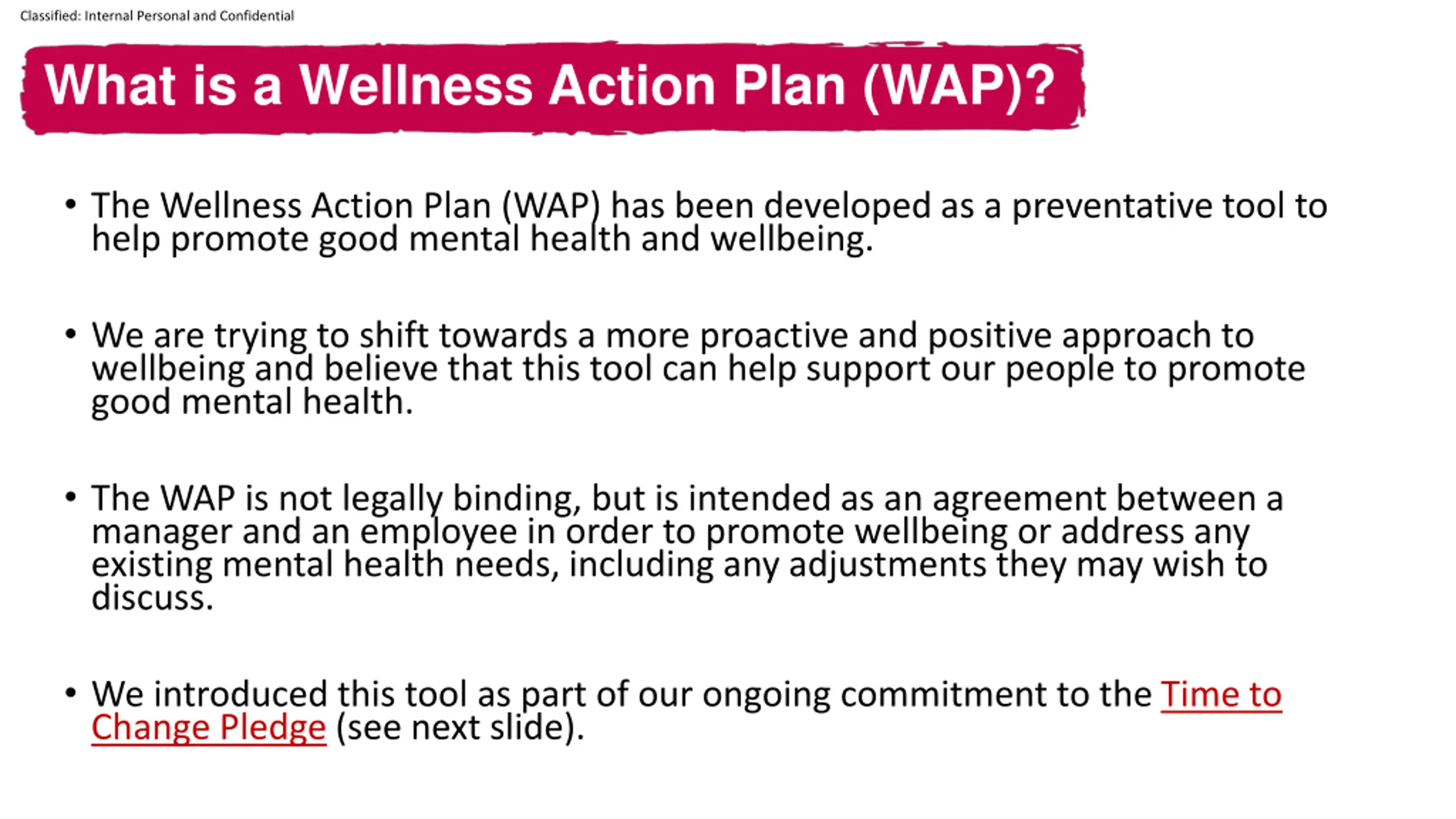 Classified: Internal Personal and Confidential What is a Wellness Action Plan (WAP)? The Wellness Action Plan (WAP) has been developed as a preventative tool to help promote good mental health and wellbeing. We are trying to shift towards a more proactive and positive approach to wellbeing and believe that this tool can help support our people to promote good mental health. The WAP is not legally binding, but is intended as an agreement between a manager and an employee in order to promote wellbeing or address any existing mental health needs, including any adjustments they may wish to discuss. We introduced this tool as part of our ongoing commitment to the Time to Change Pledge (see next slide).