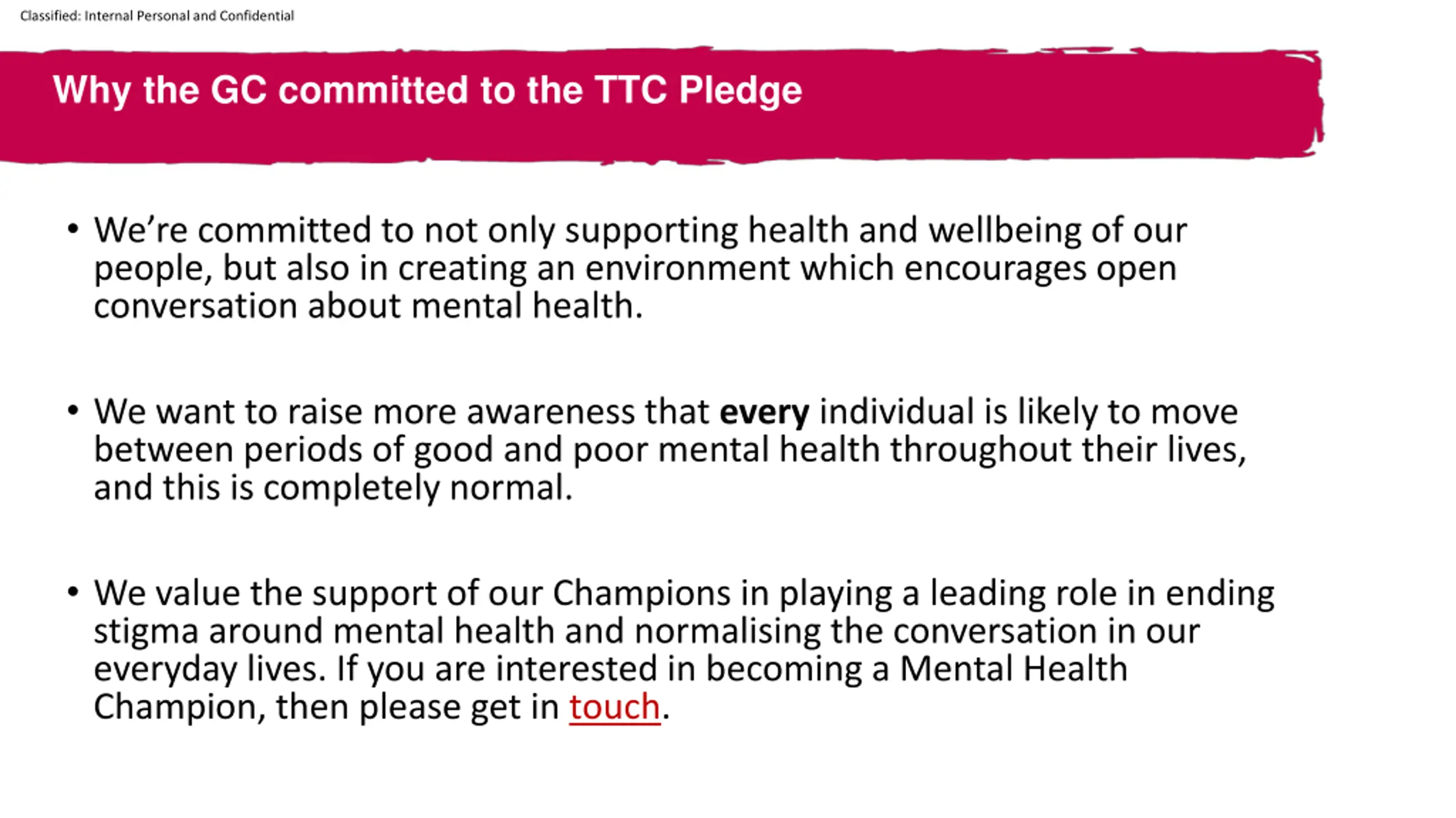 Classified: Internal Personal and Confidential Why the GC committed to the TTC Pledge We re committed to not only supporting health and wellbeing of our people, but also in creating an environment which encourages open conversation about mental health. We want to raise more awareness that every individual is likely to move between periods of good and poor mental health throughout their lives, and this is completely normal. We value the support of our Champions in playing a leading role in ending stigma around mental health and normalising the conversation in our everyday lives. If you are interested in becoming a Mental Health Champion, then please get in touch.