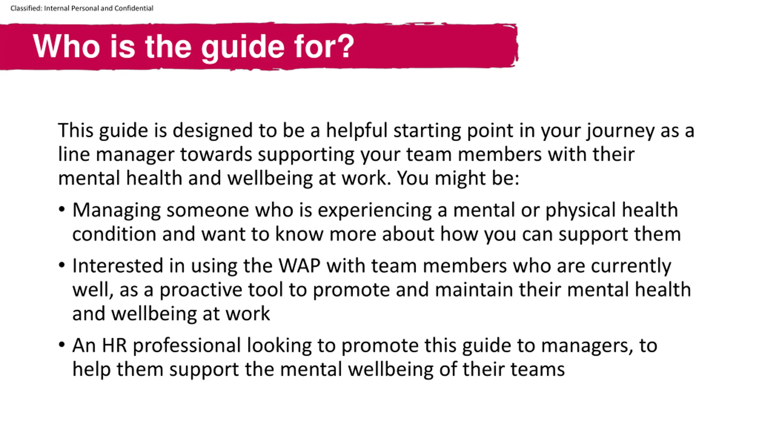 Classified: Internal Personal and Confidential Who is the guide for? This guide is designed to be a helpful starting point in your journey as a line manager towards supporting your team members with their mental health and wellbeing at work. You might be: Managing someone who is experiencing a mental or physical health condition and want to know more about how you can support them Interested in using the WAP with team members who are currently well, as a proactive tool to promote and maintain their mental health and wellbeing at work An HR professional looking to promote this guide to managers, to help them support the mental wellbeing of their teams