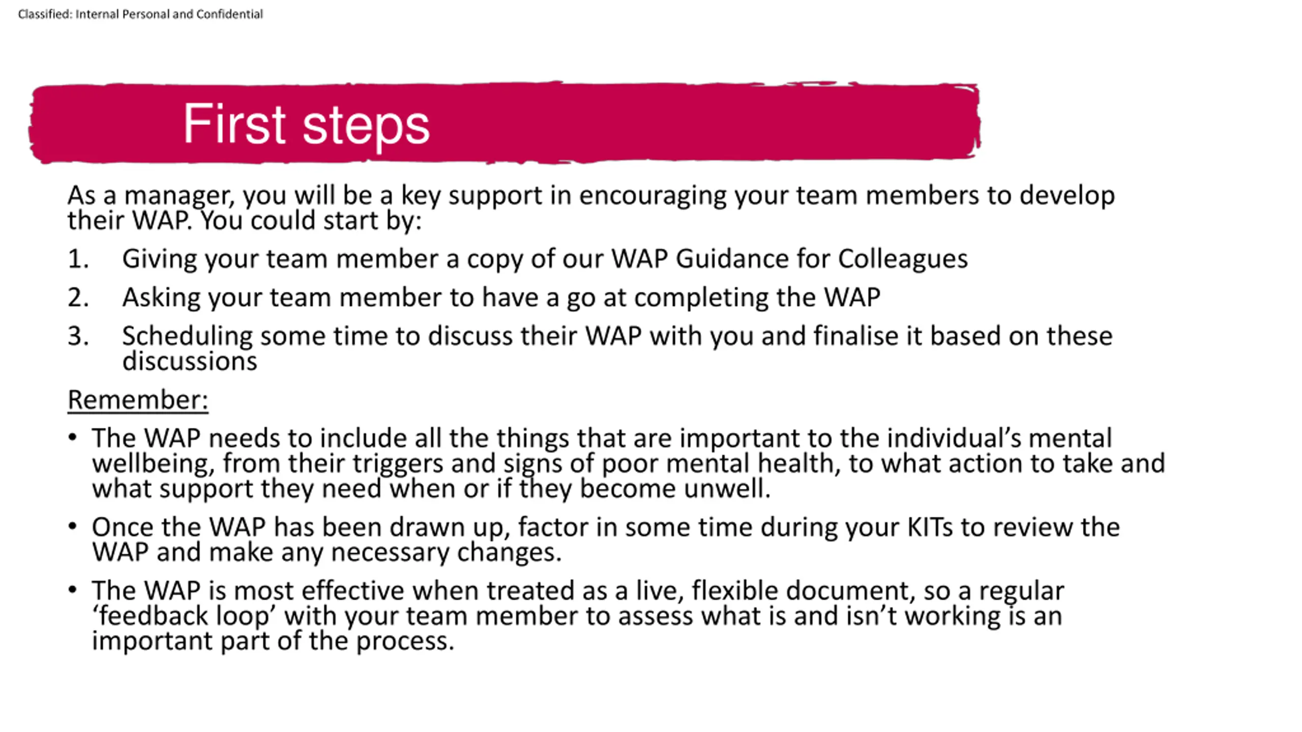Classified: Internal Personal and Confidential First steps As a manager, you will be a key support in encouraging your team members to develop their WAP. You could start by: 1. Giving your team member a copy of our WAP Guidance for Colleagues 2. Asking your team member to have a go at completing the WAP 3. Scheduling some time to discuss their WAP with you and finalise it based on these discussions Remember: The WAP needs to include all the things that are important to the individual s mental wellbeing, from their triggers and signs of poor mental health, to what action to take and what support they need when or if they become unwell. Once the WAP has been drawn up, factor in some time during your KITs to review the WAP and make any necessary changes. The WAP is most effective when treated as a live, flexible document, so a regular feedback loop with your team member to assess what is and isn t working is an important part of the process.
