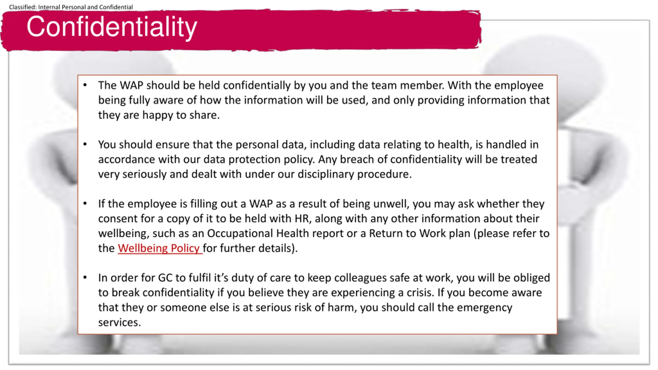 Classified: Internal Personal and Confidential Why Time to Change exists? Confidentiality The WAP should be held confidentially by you and the team member. With the employee being fully aware of how the information will be used, and only providing information that they are happy to share. You should ensure that the personal data, including data relating to health, is handled in accordance with our data protection policy. Any breach of confidentiality will be treated very seriously and dealt with under our disciplinary procedure. If the employee is filling out a WAP as a result of being unwell, you may ask whether they consent for a copy of it to be held with HR, along with any other information about their wellbeing, such as an Occupational Health report or a Return to Work plan (please refer to the Wellbeing Policy for further details). In order for GC to fulfil it s duty of care to keep colleagues safe at work, you will be obliged to break confidentiality if you believe they are experiencing a crisis. If you become aware that they or someone else is at serious risk of harm, you should call the emergency services.