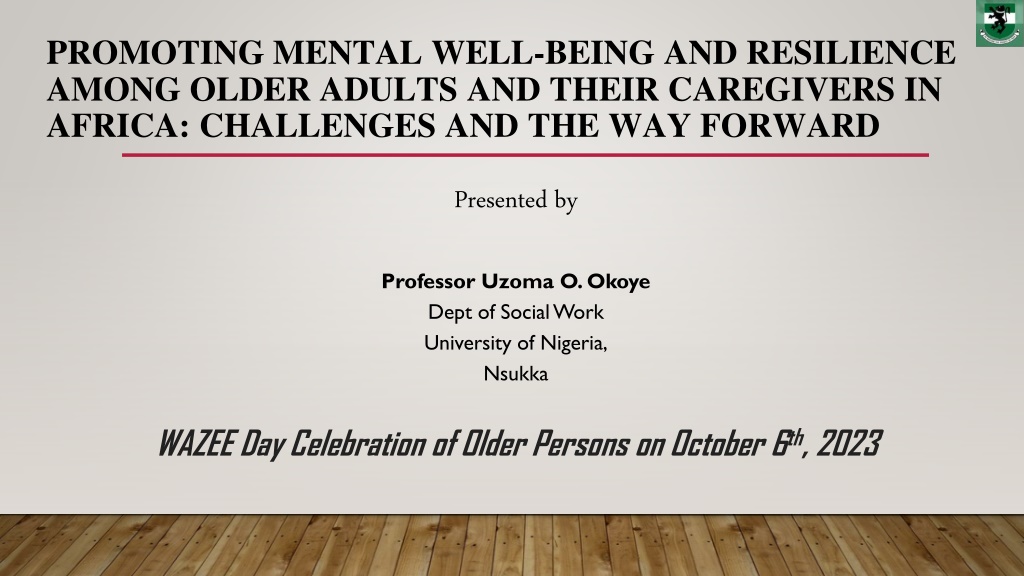 PROMOTING MENTAL WELL-BEING AND RESILIENCE AMONG OLDER ADULTS AND THEIR CAREGIVERS IN AFRICA: CHALLENGES AND THE WAY FORWARD Presented by Professor Uzoma O. Okoye Dept of Social Work University of Nigeria, Nsukka WAZEE Day Celebration of Older Persons on October 6th, 2023