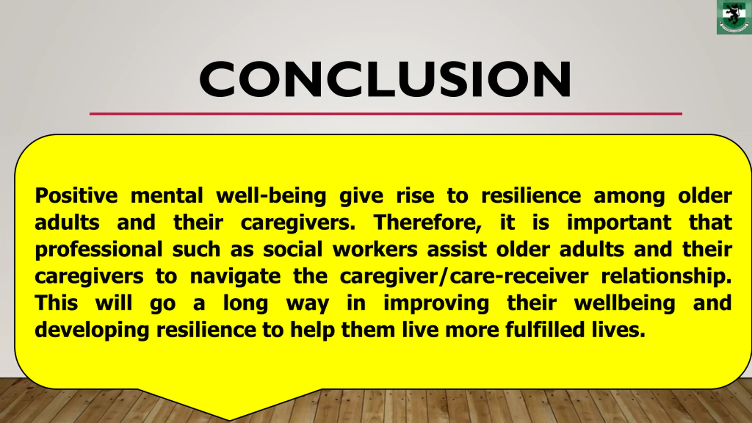 CONCLUSION Positive mental well-being give rise to resilience among older adults and their caregivers. Therefore, it is important that professional such as social workers assist older adults and their caregivers to navigate the caregiver/care-receiver relationship. This will go a long way in improving their wellbeing and developing resilience to help them live more fulfilled lives.