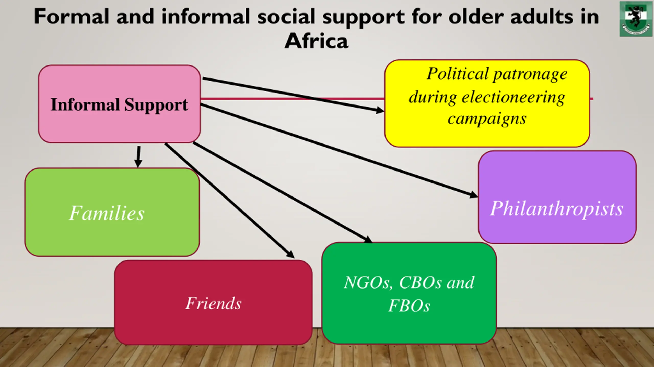 Formal and informal social support for older adults in Africa Political patronage during electioneering campaigns Informal Support Philanthropists Families NGOs, CBOs and FBOs Friends