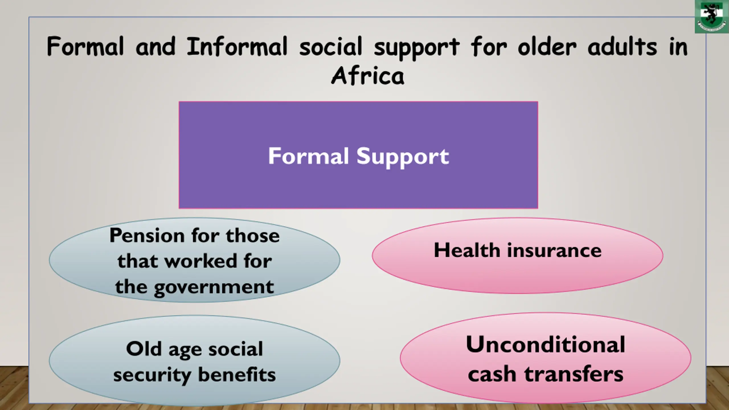 Formal and Informal social support for older adults in Africa Formal Support Pension for those that worked for the government Health insurance Unconditional cash transfers Old age social security benefits
