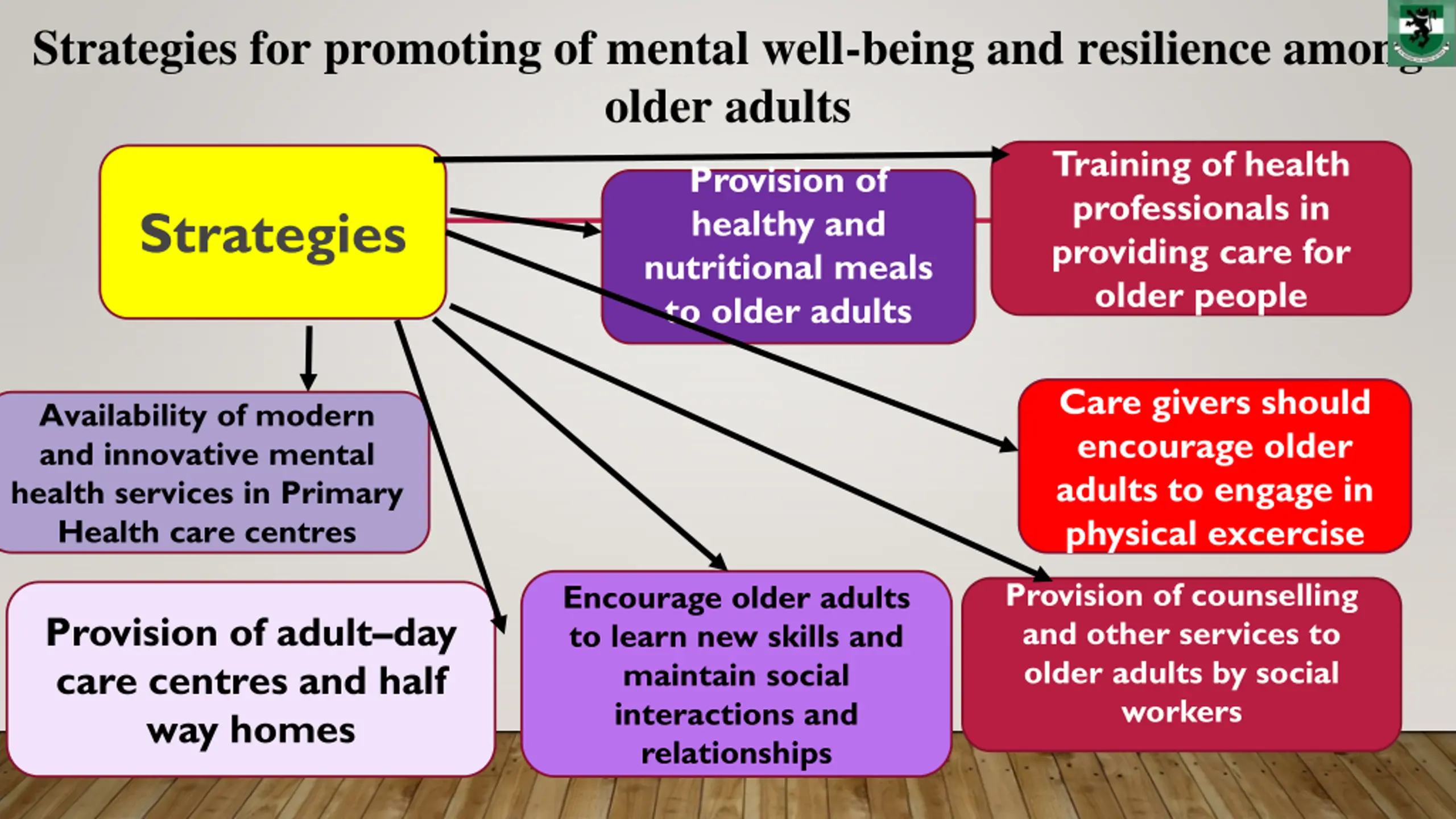 Strategies for promoting of mental well-being and resilience among older adults Training of health professionals in providing care for older people Provision of healthy and nutritional meals to older adults Strategies Care givers should encourage older adults to engage in physical excercise Availability of modern and innovative mental health services in Primary Health care centres Provision of counselling and other services to older adults by social workers Encourage older adults to learn new skills and maintain social interactions and relationships Provision of adult day care centres and half way homes
