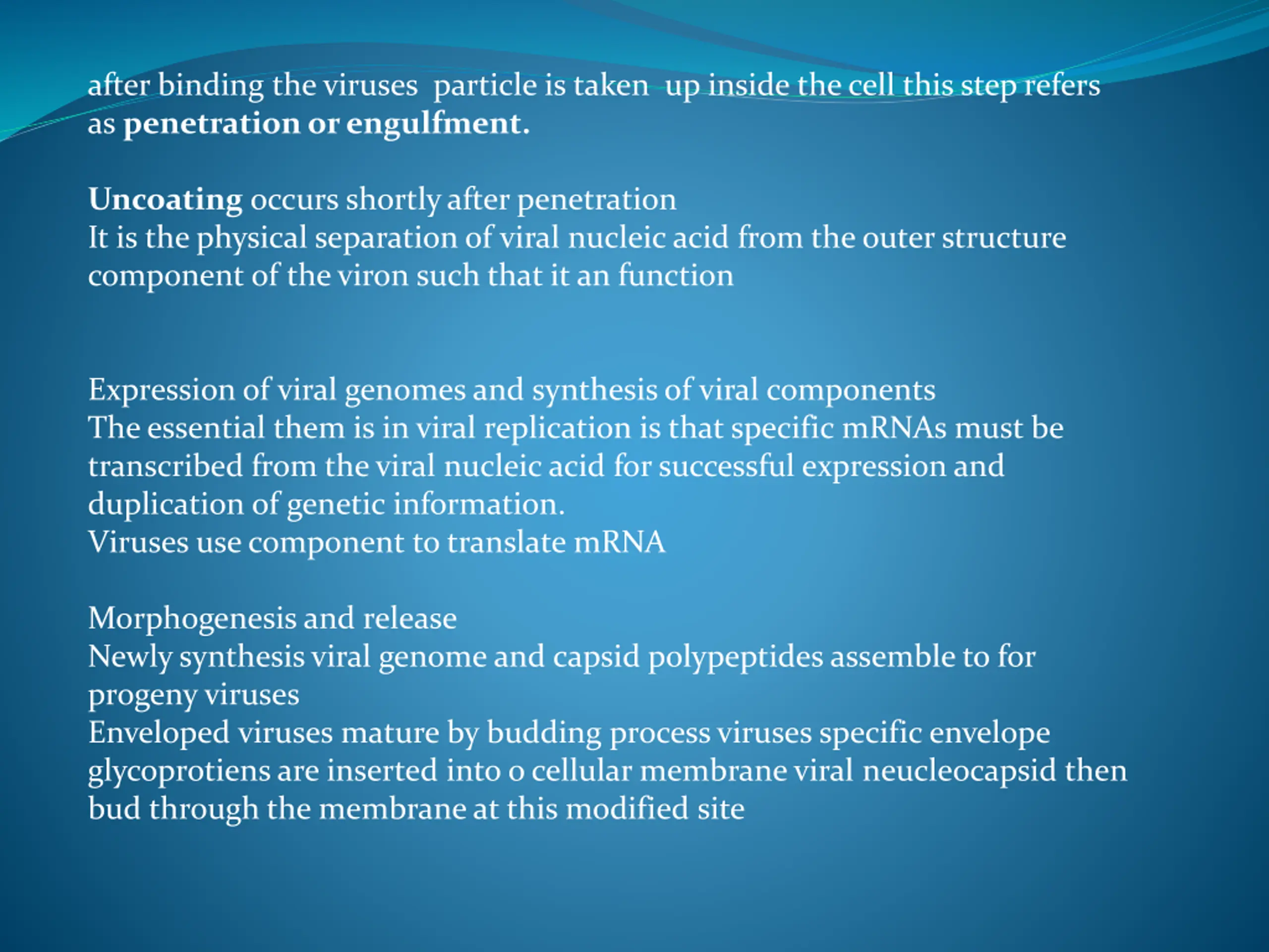 after binding the viruses particle is taken up inside the cell this step refers as penetration or engulfment. Uncoating occurs shortly after penetration It is the physical separation of viral nucleic acid from the outer structure component of the viron such that it an function Expression of viral genomes and synthesis of viral components The essential them is in viral replication is that specific mRNAs must be transcribed from the viral nucleic acid for successful expression and duplication of genetic information. Viruses use component to translate mRNA Morphogenesis and release Newly synthesis viral genome and capsid polypeptides assemble to for progeny viruses Enveloped viruses mature by budding process viruses specific envelope glycoprotiens are inserted into o cellular membrane viral neucleocapsid then bud through the membrane at this modified site