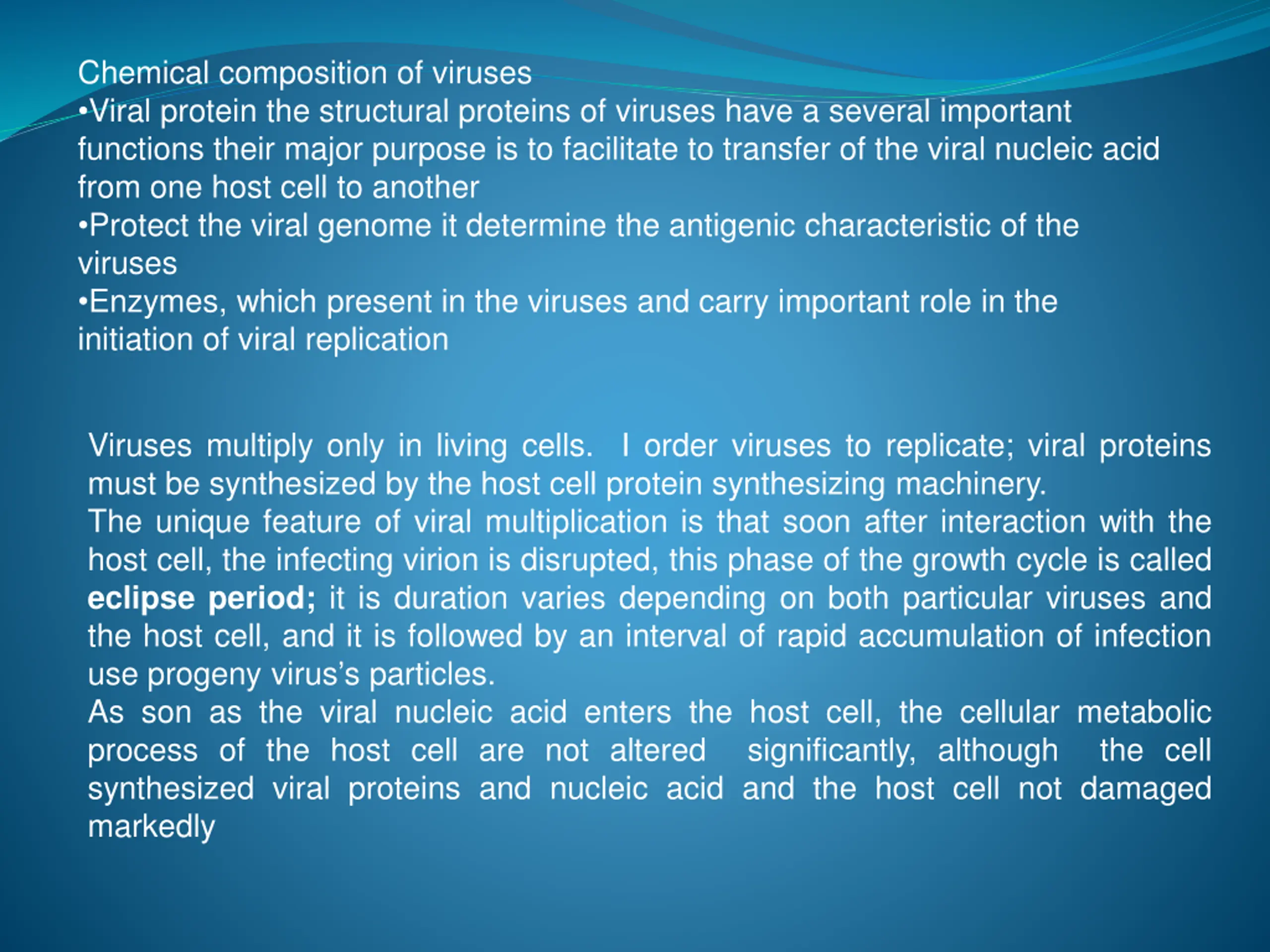 Chemical composition of viruses Viral protein the structural proteins of viruses have a several important functions their major purpose is to facilitate to transfer of the viral nucleic acid from one host cell to another Protect the viral genome it determine the antigenic characteristic of the viruses Enzymes, which present in the viruses and carry important role in the initiation of viral replication Viruses multiply only in living cells. I order viruses to replicate; viral proteins must be synthesized by the host cell protein synthesizing machinery. The unique feature of viral multiplication is that soon after interaction with the host cell, the infecting virion is disrupted, this phase of the growth cycle is called eclipse period; it is duration varies depending on both particular viruses and the host cell, and it is followed by an interval of rapid accumulation of infection use progeny virus s particles. As son as the viral nucleic acid enters the host cell, the cellular metabolic process of the host cell are not altered significantly, although the cell synthesized viral proteins and nucleic acid and the host cell not damaged markedly