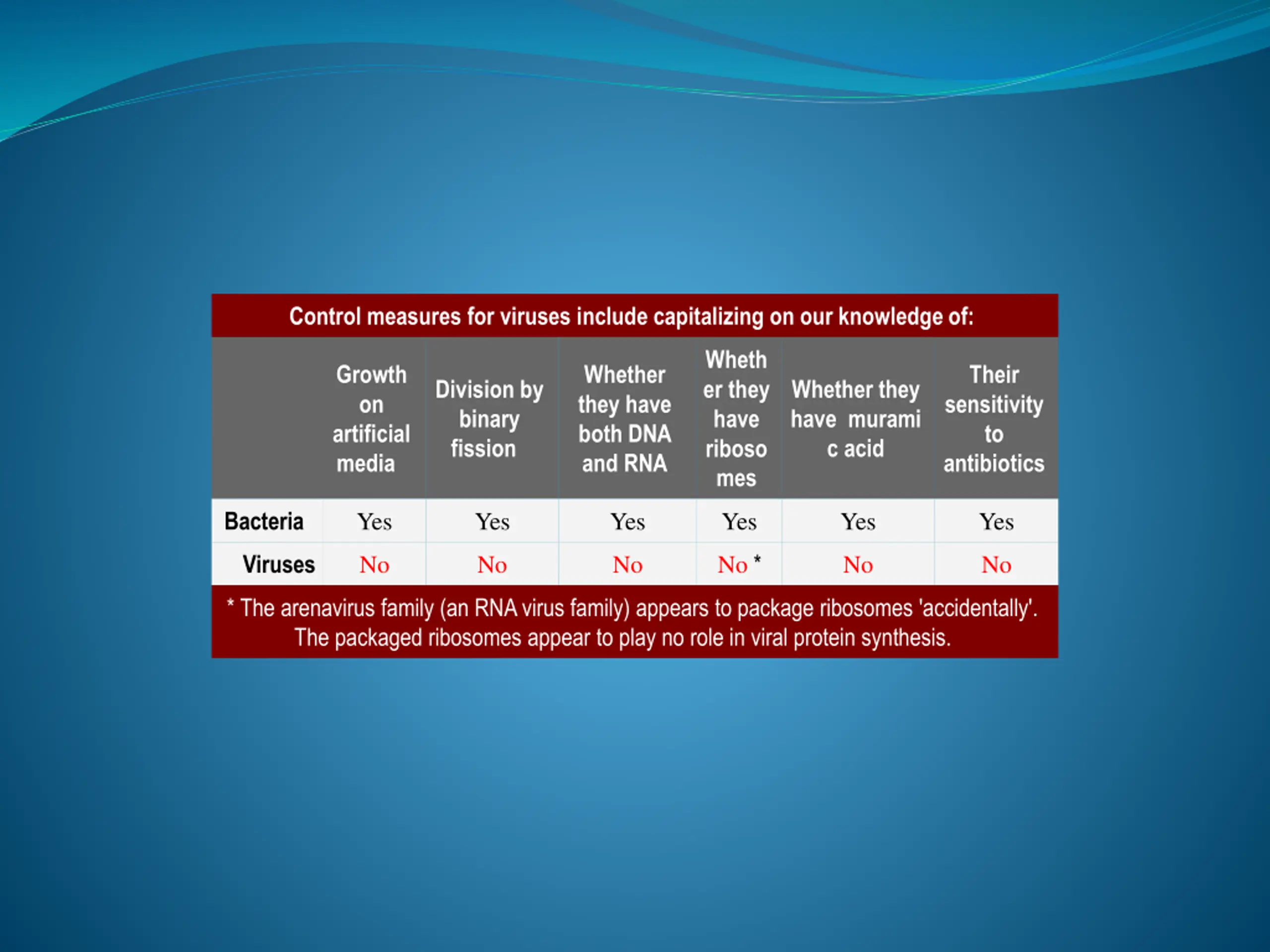 Control measures for viruses include capitalizing on our knowledge of: Wheth er they have riboso mes Growth on artificial media Whether they have both DNA and RNA Their sensitivity to antibiotics Division by binary fission Whether they have murami c acid Bacteria Yes Yes Yes Yes Yes Yes Viruses No * No No No No No * The arenavirus family (an RNA virus family) appears to package ribosomes 'accidentally'. The packaged ribosomes appear to play no role in viral protein synthesis.