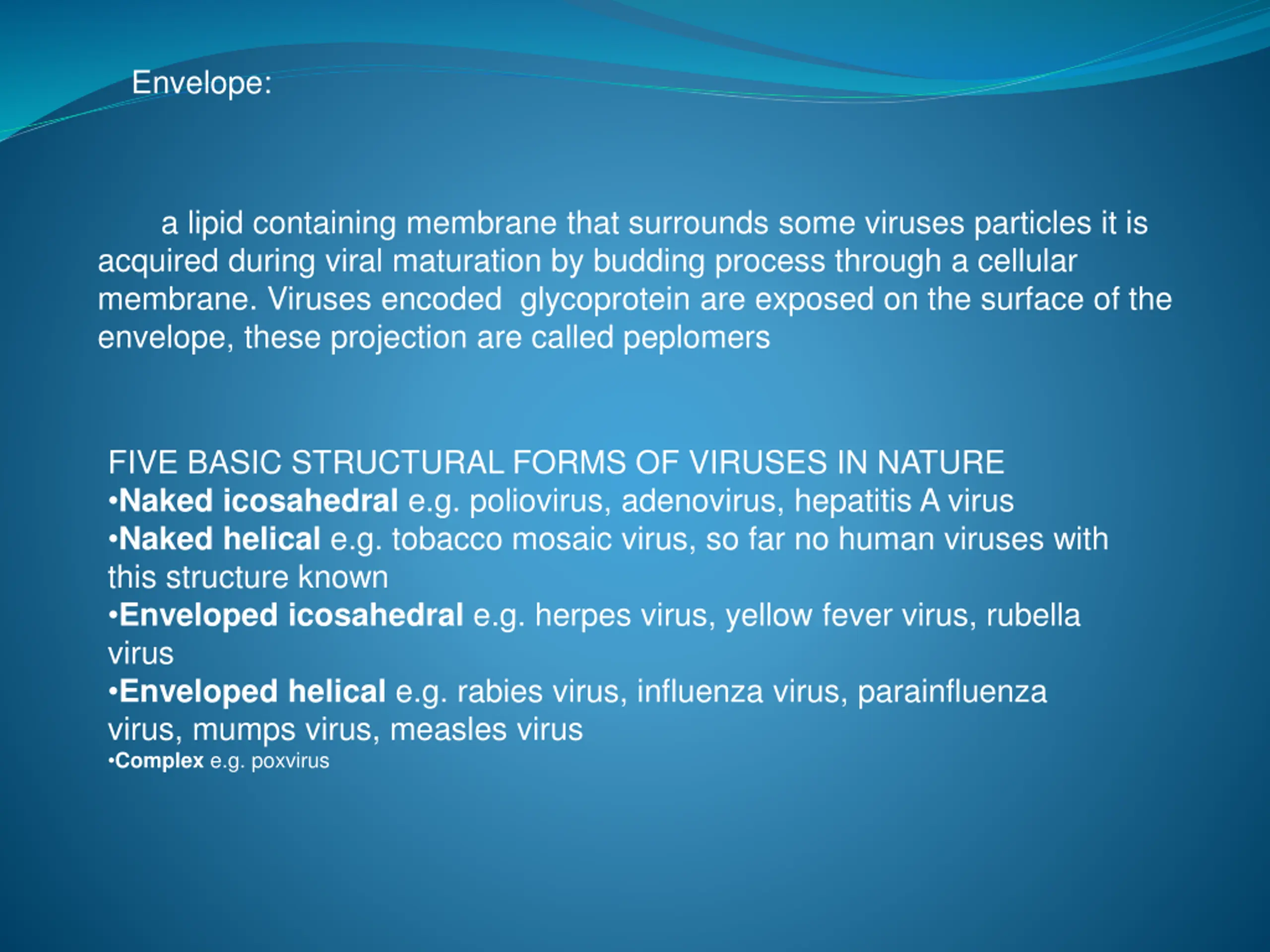 Envelope: a lipid containing membrane that surrounds some viruses particles it is acquired during viral maturation by budding process through a cellular membrane. Viruses encoded glycoprotein are exposed on the surface of the envelope, these projection are called peplomers FIVE BASIC STRUCTURAL FORMS OF VIRUSES IN NATURE Naked icosahedral e.g. poliovirus, adenovirus, hepatitis A virus Naked helical e.g. tobacco mosaic virus, so far no human viruses with this structure known Enveloped icosahedral e.g. herpes virus, yellow fever virus, rubella virus Enveloped helical e.g. rabies virus, influenza virus, parainfluenza virus, mumps virus, measles virus Complex e.g. poxvirus