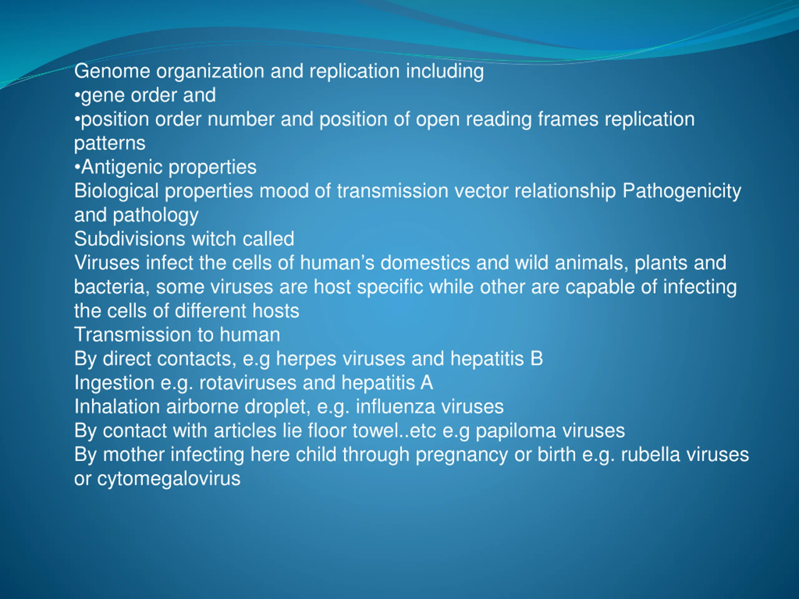 Genome organization and replication including gene order and position order number and position of open reading frames replication patterns Antigenic properties Biological properties mood of transmission vector relationship Pathogenicity and pathology Subdivisions witch called Viruses infect the cells of human s domestics and wild animals, plants and bacteria, some viruses are host specific while other are capable of infecting the cells of different hosts Transmission to human By direct contacts, e.g herpes viruses and hepatitis B Ingestion e.g. rotaviruses and hepatitis A Inhalation airborne droplet, e.g. influenza viruses By contact with articles lie floor towel..etc e.g papiloma viruses By mother infecting here child through pregnancy or birth e.g. rubella viruses or cytomegalovirus