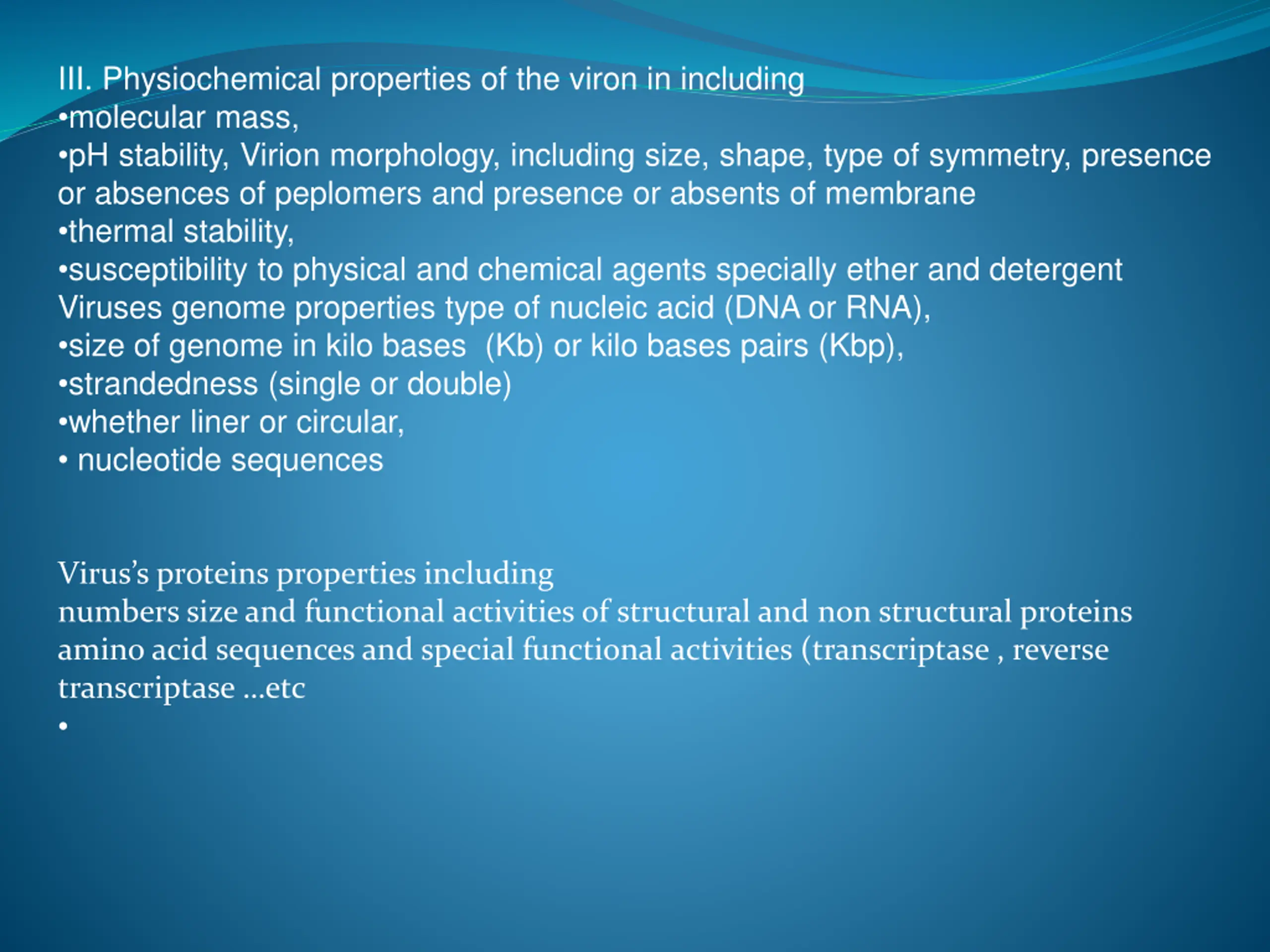 III. Physiochemical properties of the viron in including molecular mass, pH stability, Virion morphology, including size, shape, type of symmetry, presence or absences of peplomers and presence or absents of membrane thermal stability, susceptibility to physical and chemical agents specially ether and detergent Viruses genome properties type of nucleic acid (DNA or RNA), size of genome in kilo bases (Kb) or kilo bases pairs (Kbp), strandedness (single or double) whether liner or circular, nucleotide sequences Virus s proteins properties including numbers size and functional activities of structural and non structural proteins amino acid sequences and special functional activities (transcriptase , reverse transcriptase etc