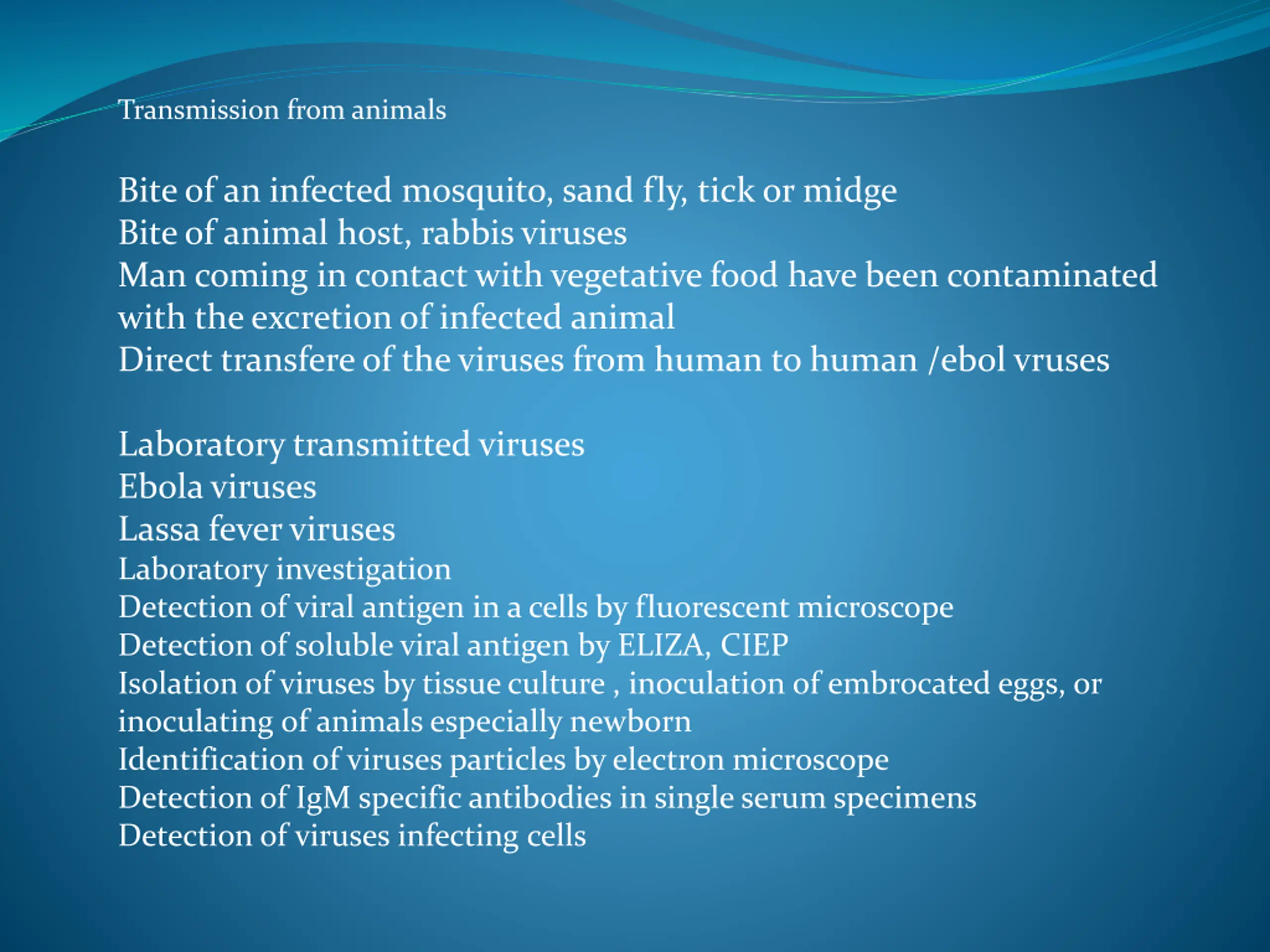 Transmission from animals Bite of an infected mosquito, sand fly, tick or midge Bite of animal host, rabbis viruses Man coming in contact with vegetative food have been contaminated with the excretion of infected animal Direct transfereof the viruses from human to human /ebol vruses Laboratory transmitted viruses Ebola viruses Lassa fever viruses Laboratory investigation Detection of viral antigen in a cells by fluorescent microscope Detection of soluble viral antigen by ELIZA, CIEP Isolation of viruses by tissue culture , inoculation of embrocated eggs, or inoculating of animals especially newborn Identification of viruses particles by electron microscope Detection of IgM specific antibodies in single serum specimens Detection of viruses infecting cells