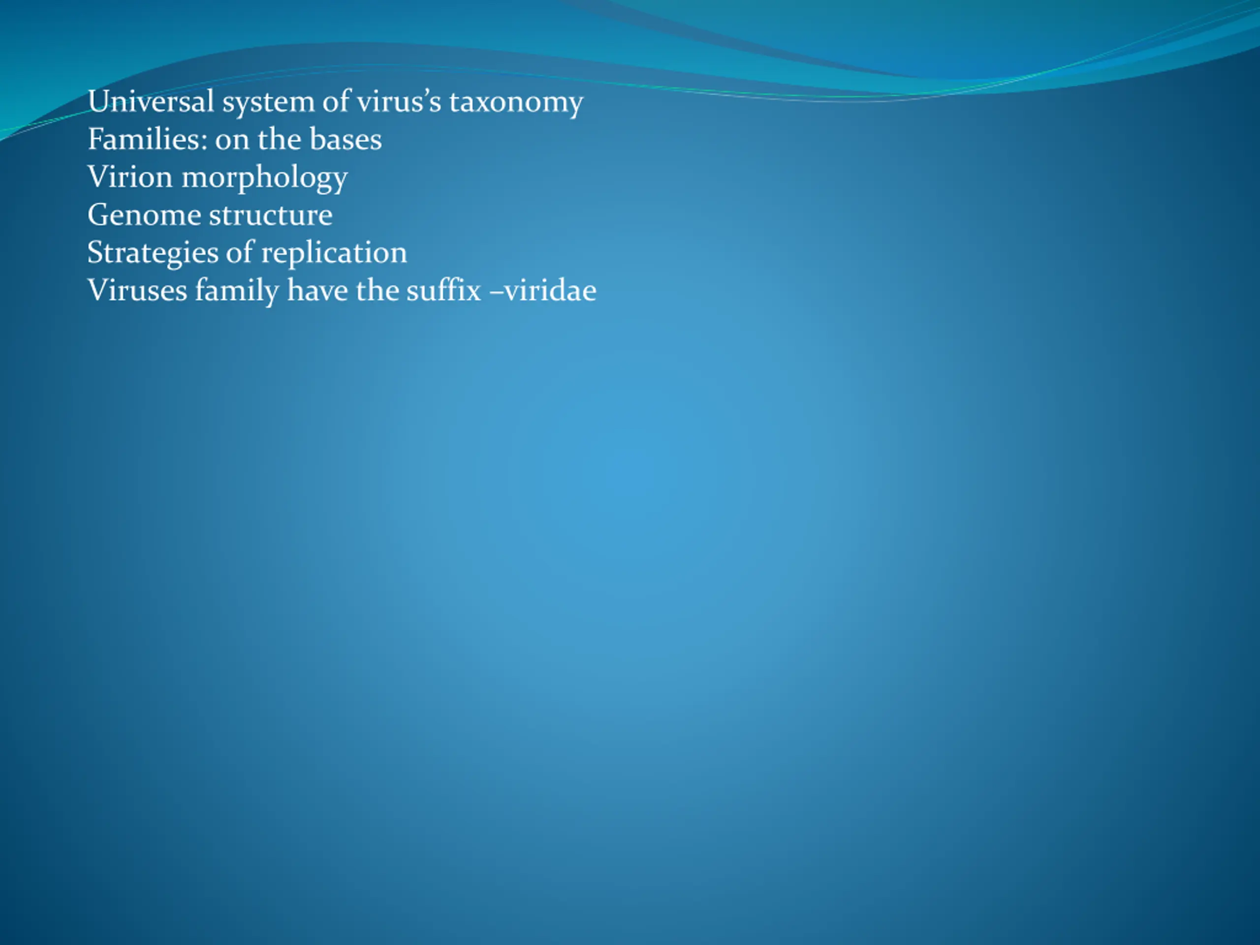 Universal system of viruss taxonomy Families: on the bases Virion morphology Genome structure Strategies of replication Viruses family have the suffix viridae